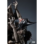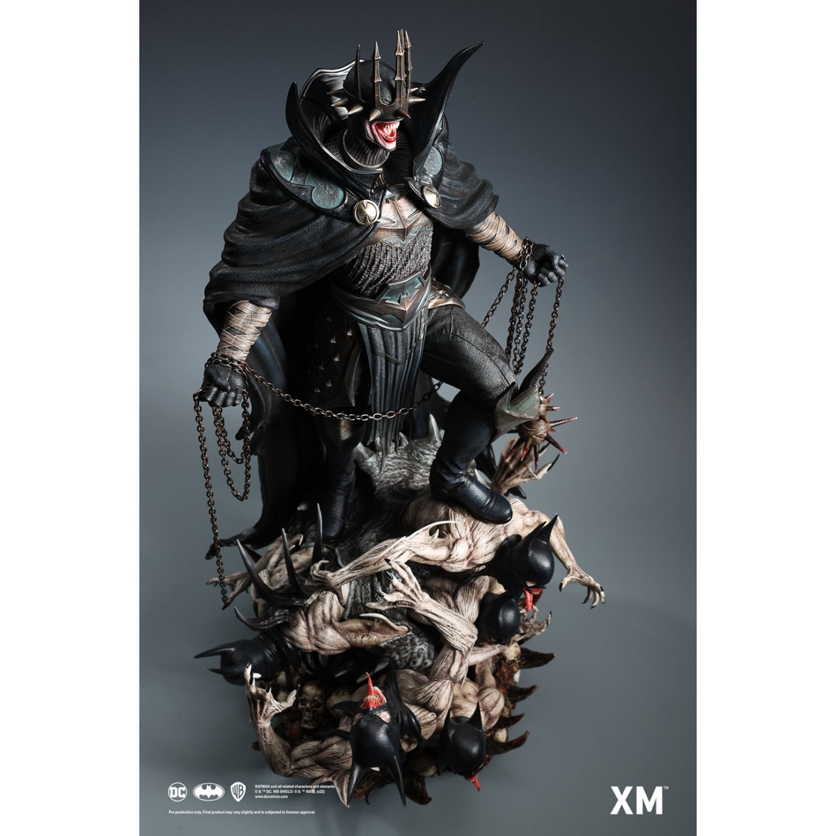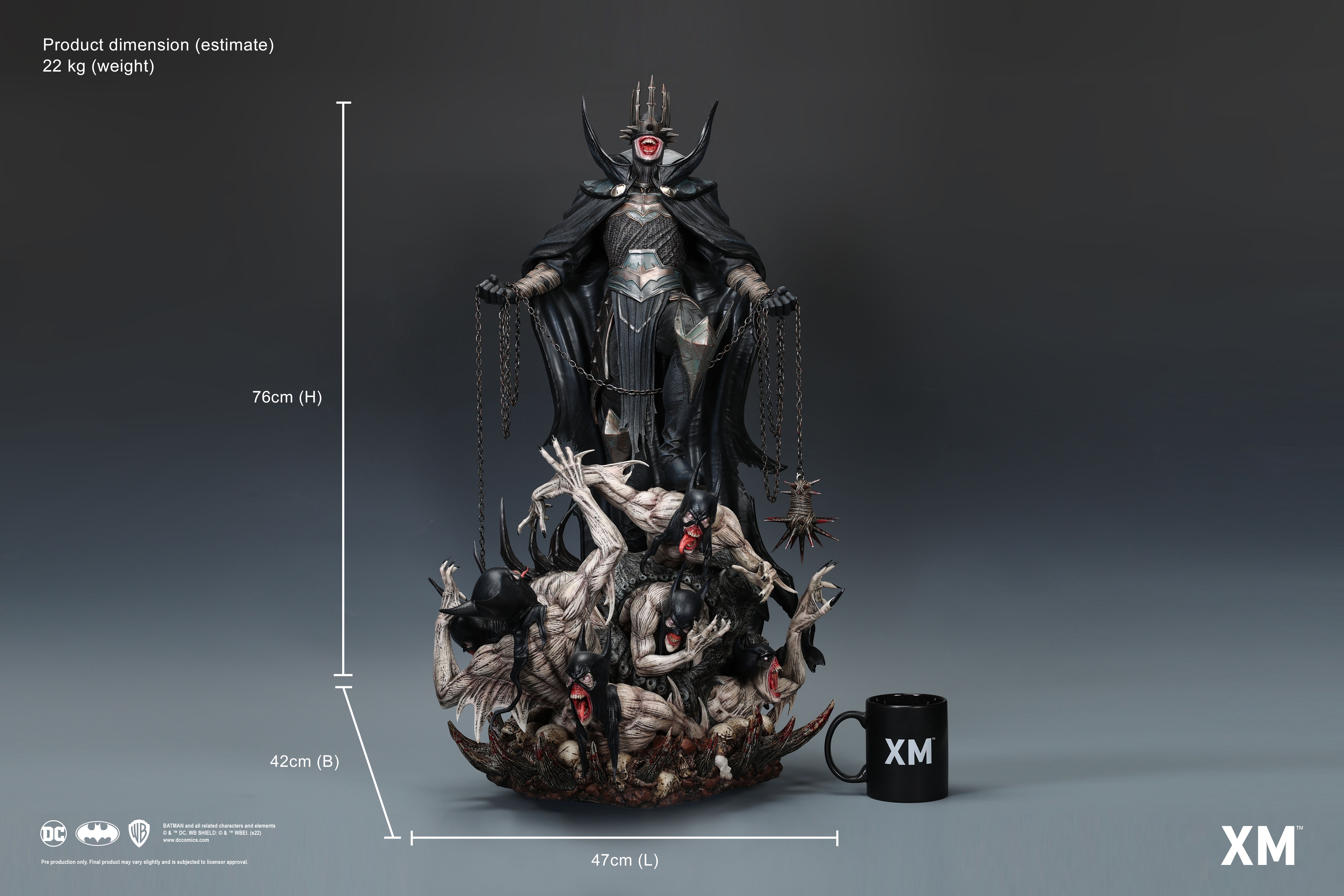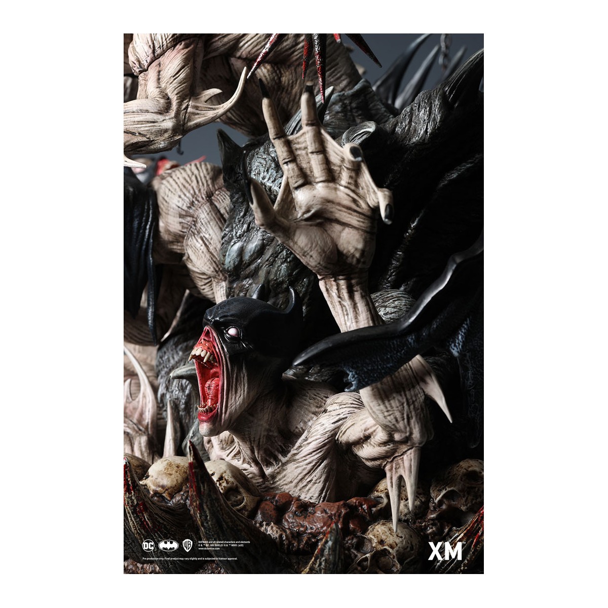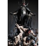 Featuring The Batman Who Laughs standing upon a mosh pit of bone and flesh, this statue is an interpretive piece that was conceptualised to be an amalgamation of power, death, and unhinged insanity. The gruesome base of this statue features his minions uncomfortably stacked above crushed skulls within the void as they jostle outwards with bloodshot but empty wide-open white eyes and sharp claw-like fingers with bat-masks drawn over their heads.