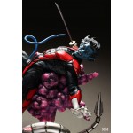Nightcrawler’s agility and acrobatic reflexes are showcased here as he teleports away from Sentinel’s tentacles, leaving a trail of BAMF! cloud as he carries the momentum and prepares to launch a downward attack. This is a dynamic piece packed with movement and action that is further highlighted by the Sentinel’s tentacles twining around, following the mutant hero as Sentinel attempts an attack.