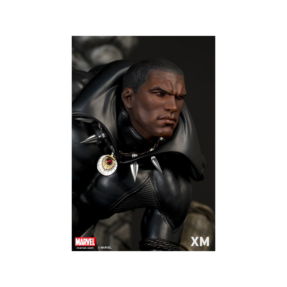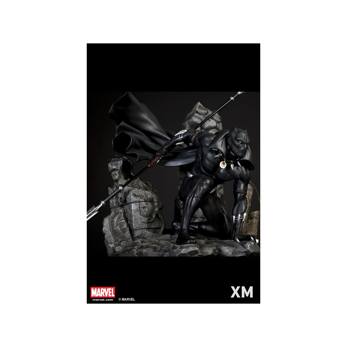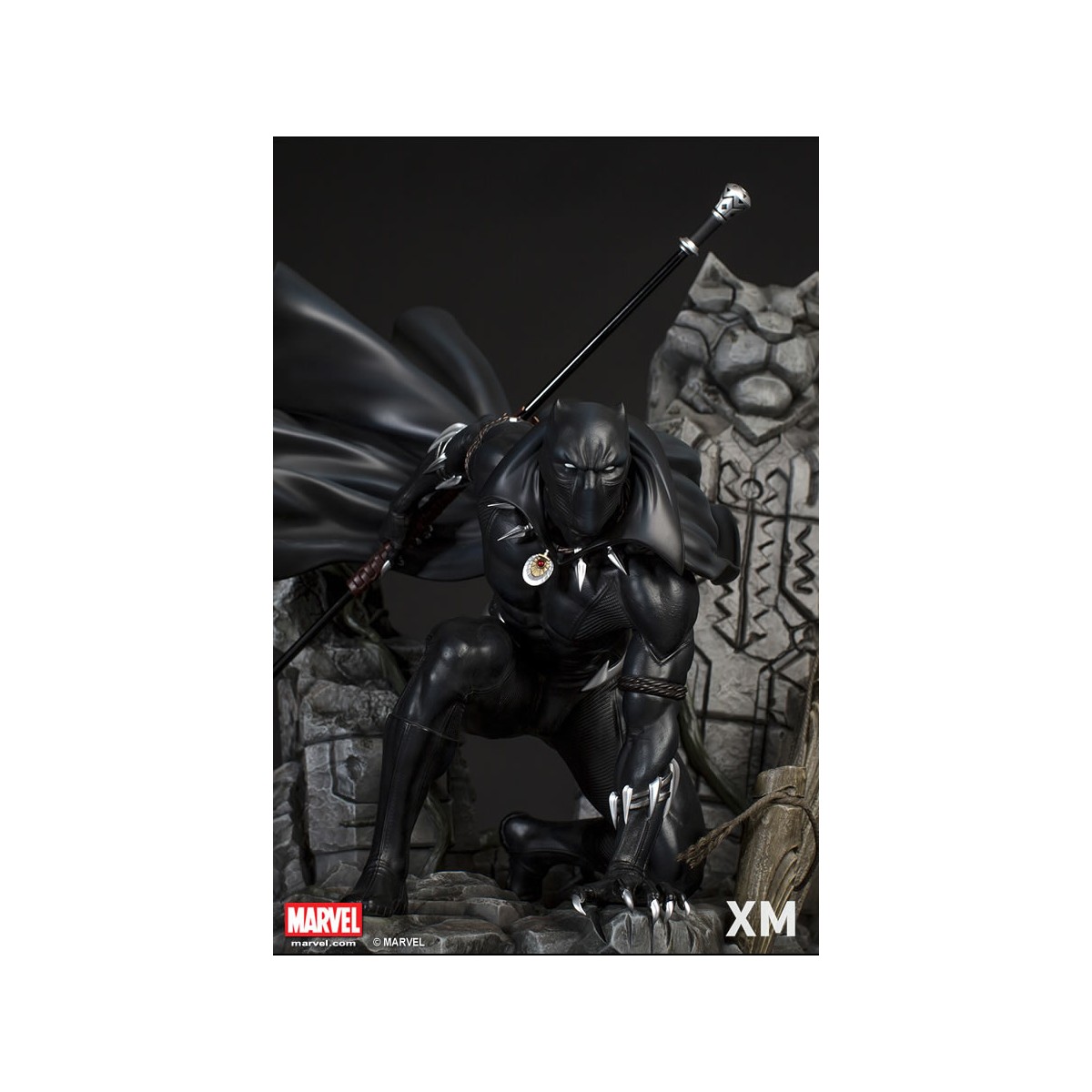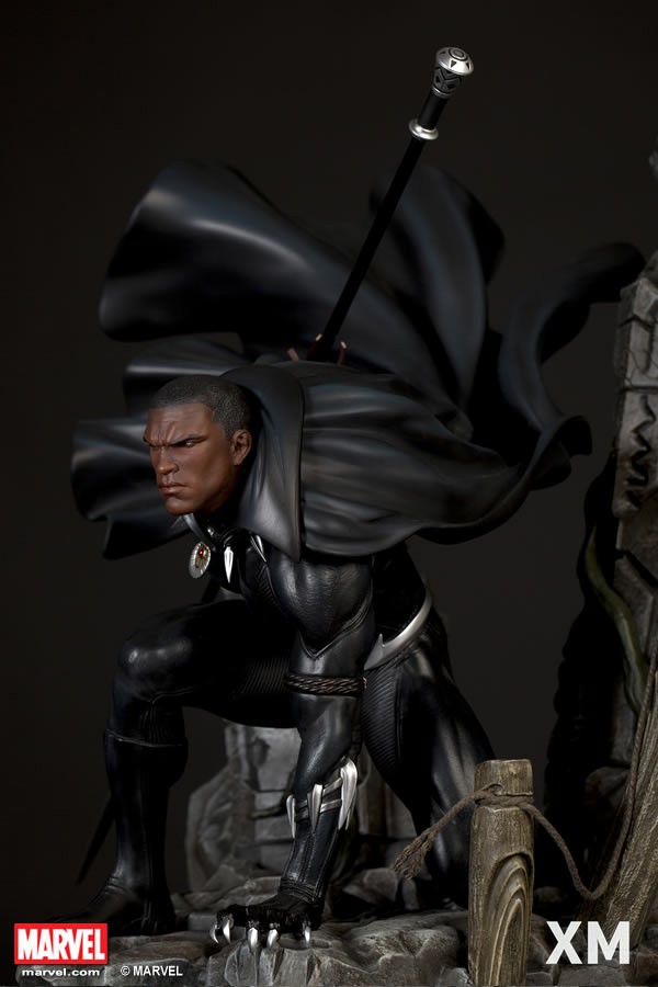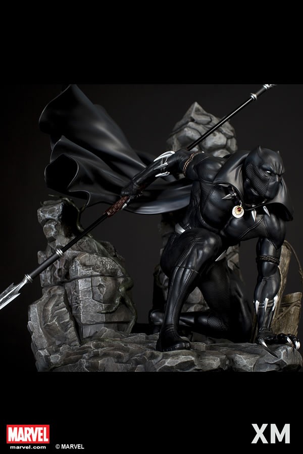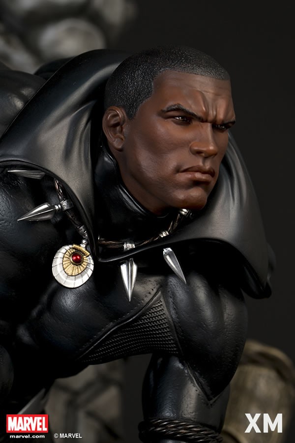 XM Studios is excited to present our next Marvel Premium Collectibles series statue, Black Panther! The King of Wakanda, also known as the Black Panther is immortalized in amazingly detailed 1:4 scale cold-cast porcelain. Each painstakingly handcrafted statue is individually hand-painted with the highest possible quality finish. Set against a Wakanda themed backdrop, Black Panther is depicted crouching ready for battle brandishing a Vibranium spear. The statue also comes with an alternate handsome unmasked portrait.