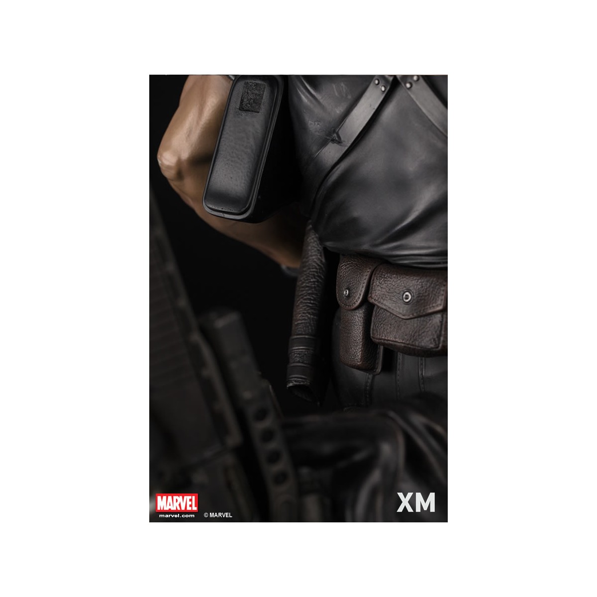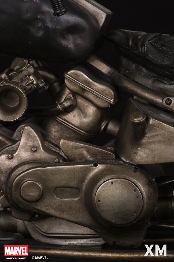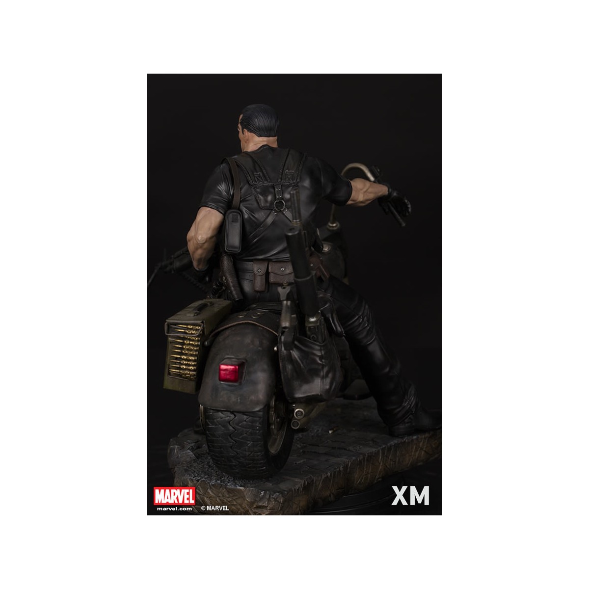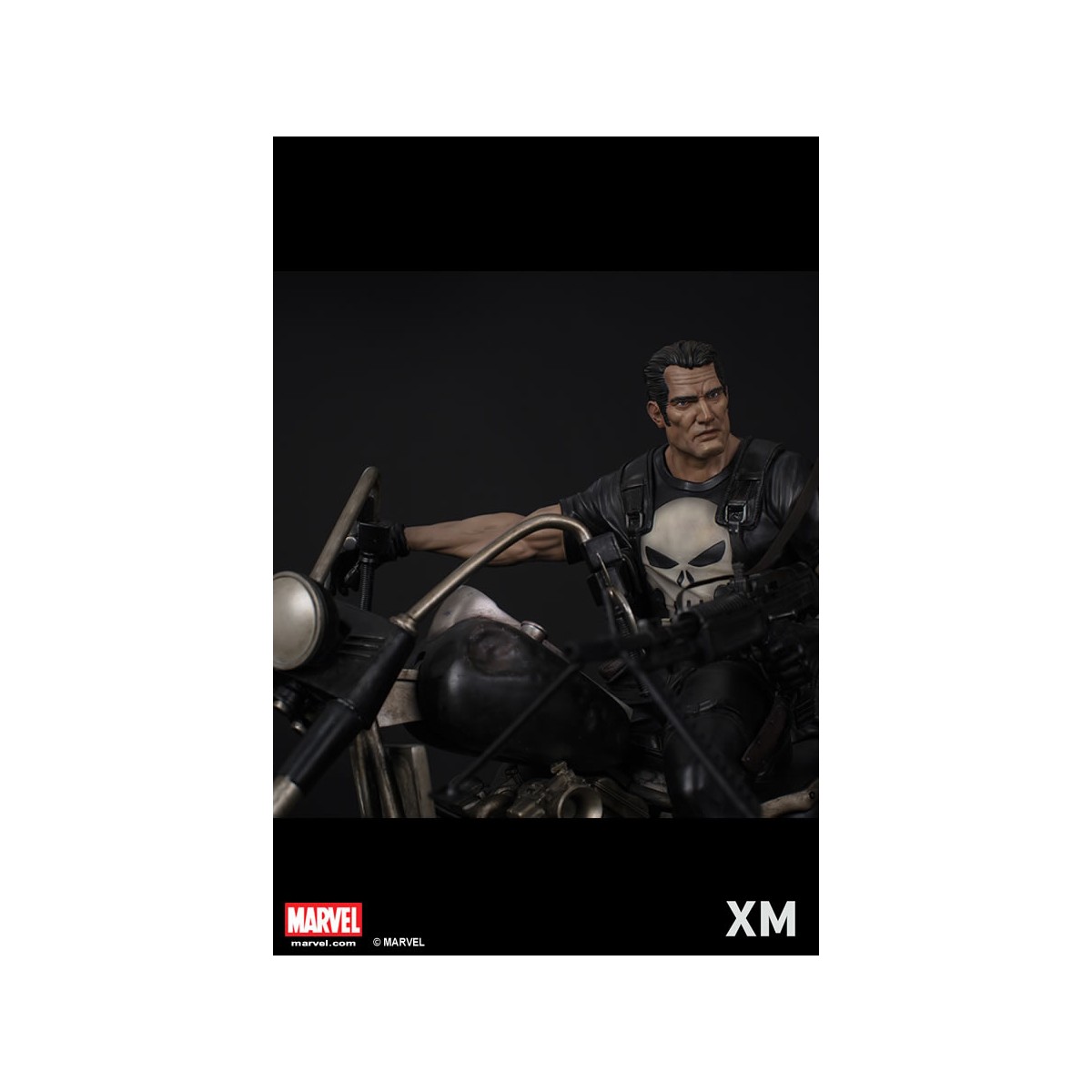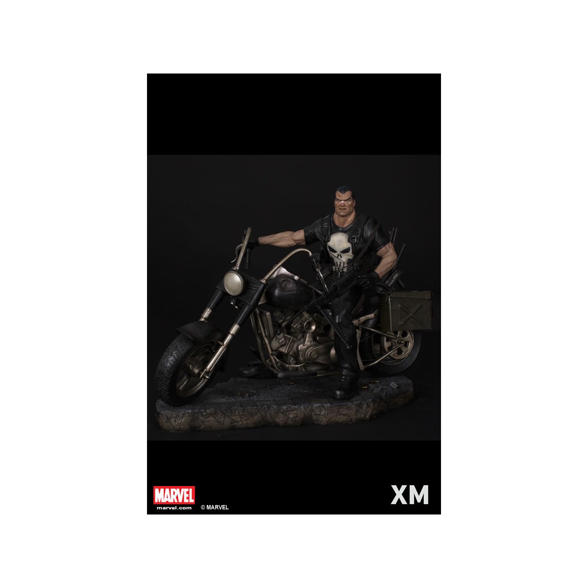 XM Studios is excited to present our next Marvel Premium Collectibles series statue, Punisher! The war veteran turned one-man army vigilante is immortalized in amazingly detailed 1:4 scale cold-cast porcelain. Each painstakingly handcrafted statue stands at approximately 62 cm tall and every piece individually hand-painted with the highest possible quality finish. Seated on a battle damaged chopper bike with a stockpile of ammunitions and weapons, the Punisher is well armed to inflict punishment on criminals! An amazingly detailed piece with simulated wet roads on the base, the Punisher is the perfect companion piece to XM’s Daredevil and Ghost Rider!