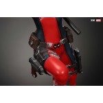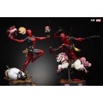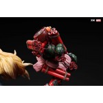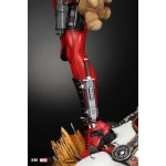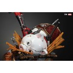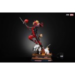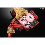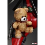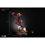 The Lady Deadpool statue depicts a fully masked Wanda in her signature red and black suit. On her left, she holds a katana with Headpool attached to it while on her right she holds a backpack strapped with dynamites, ready to fling it at her enemies. Designed to be a companion piece to XM’s Deadpool, it features a similar merry-go-round amusement ride thematic base with a destroyed seat.