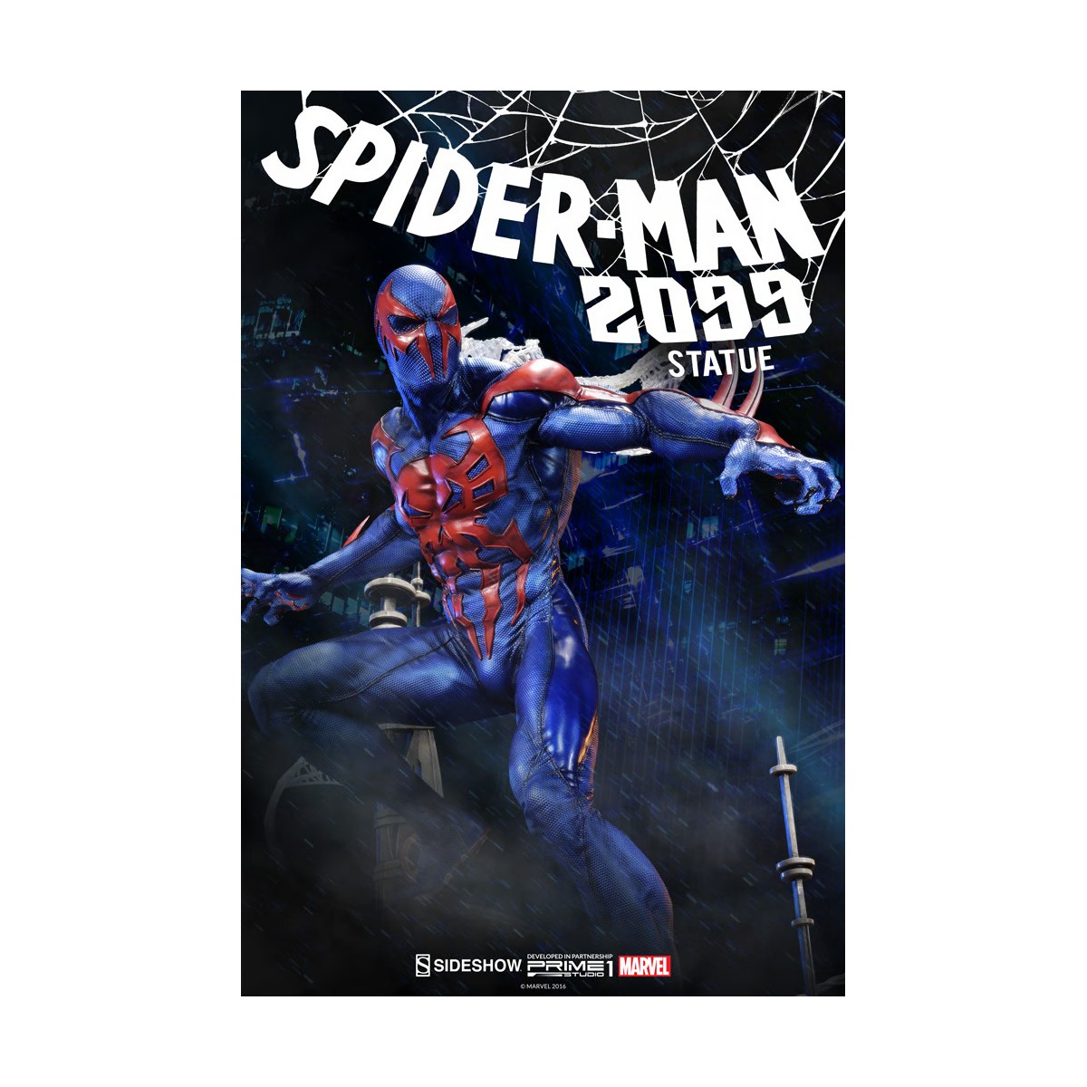 Developed and manufactured in partnership with Prime 1 Studio, we are proud to present Spider-Man 2099. On Earth-928 the year is 2099, Miguel O’Hara worked as the head of the genetics department for the Alchemax Corporation, specializing in genetic coding and slicing. He toyed with the idea of recreating the powers of the original Spider-Man from years ago. Miguel decided to try to genetically cure himself by rewriting his genetic code from a sample he had taken previously. The results gave him spider-like powers. At this moment, Miguel began fighting crime and the evil corporation Alchemax As Spider-Man.