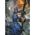 “Clint” Barton was only 14 when he joined a carnival and attracted the attention of the show’s star Jacques Duquesne, the Swordsman. Duquesne trained Barton in the art of throwing knives, but quickly realized the boy was natural at archery and turned him over to Trickshot, the carnival’s archer. On stage, Barton was known as Hawkeye the Marksman. While Hawkeye has no superhuman powers (with the exception of the period when using Pym particles to become Goliath), he is at the very peak of human conditioning; he is an exceptional fencer, acrobat and a grandmaster marksman, having been trained from childhood in the circus and by the criminals Trick Shot and Swordsman. This includes considerable strength, as a super villain found out when he tried to use the superhero's 250 pounds-force (1,100 newtons) draw weight bow and found that he could not draw back the string to launch an arrow. Hawkeye has also been thoroughly trained by Captain America in tactics, martial arts, and hand-to-hand combat.