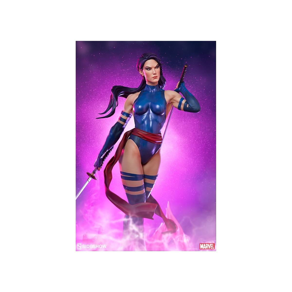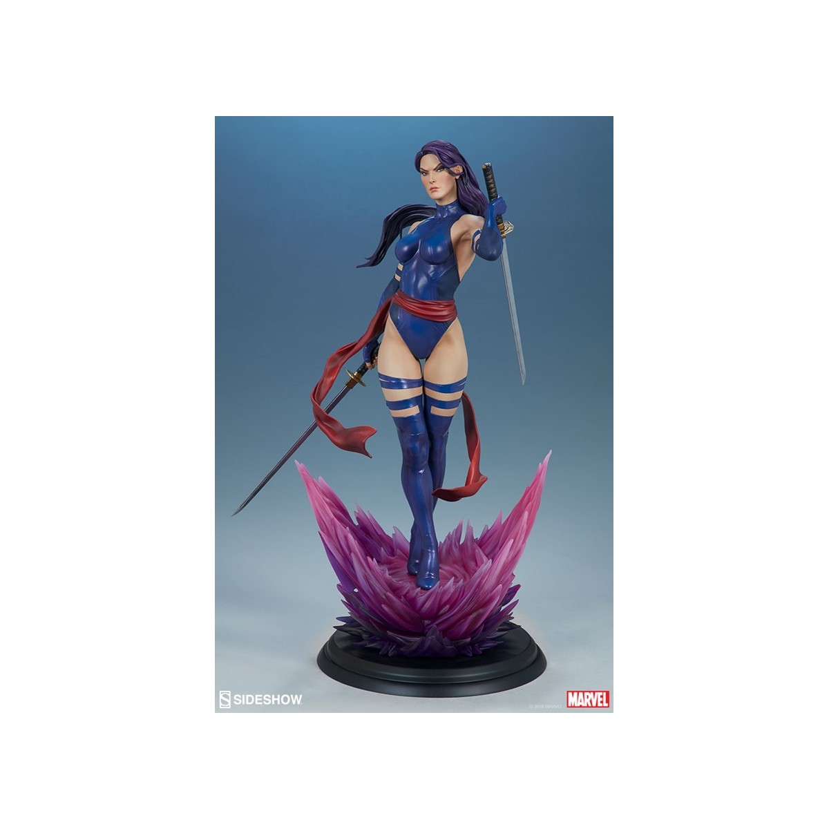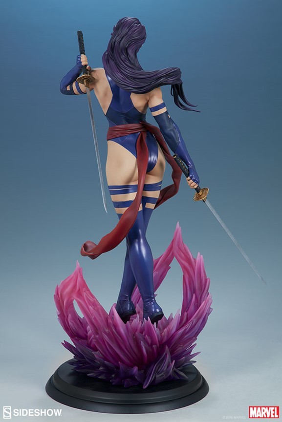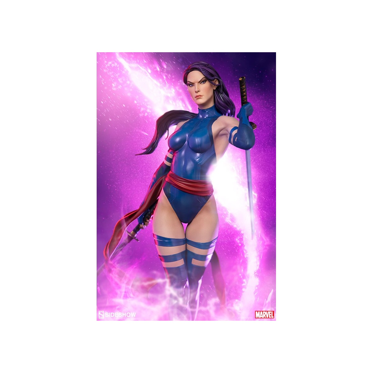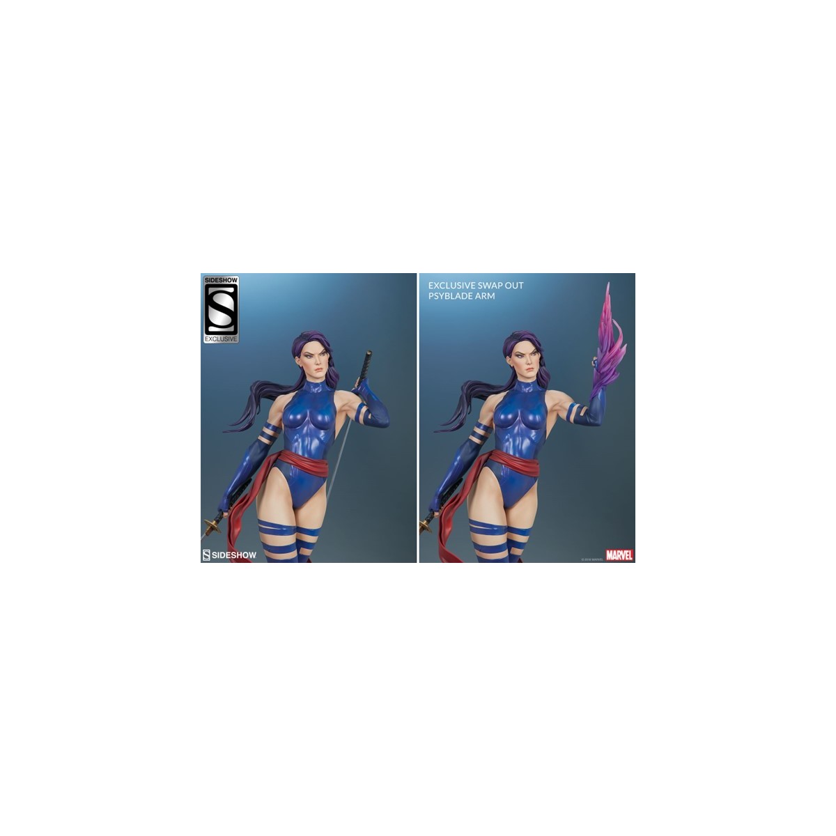 The polyresin Psylocke Premium Format™ Figure features an all-sculpt costume based on her beloved 90’s look with a blue bodysuit, arm guards, and boots. Her suit also includes a red sculpted sash, fluttering with dynamic motion as she holds her dual katanas at the ready. Psylocke’s beautifully sculpted portrait is detailed flowing purple hair and piercing purple eyes, capturing all the focus of her physical and psychic abilities.