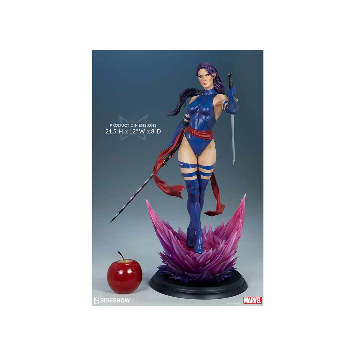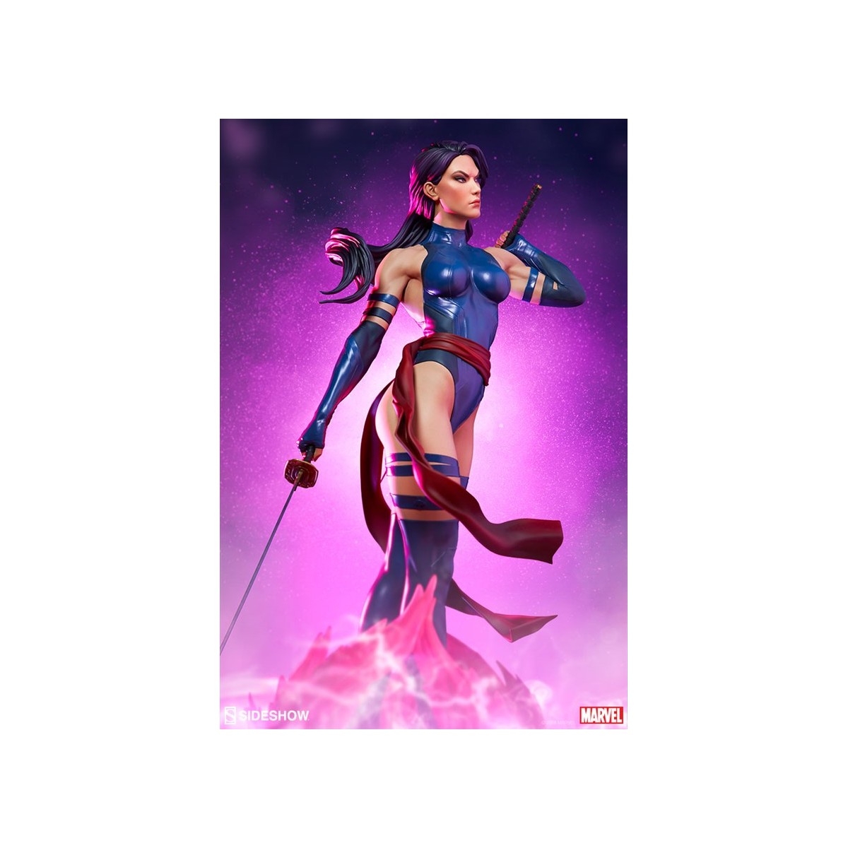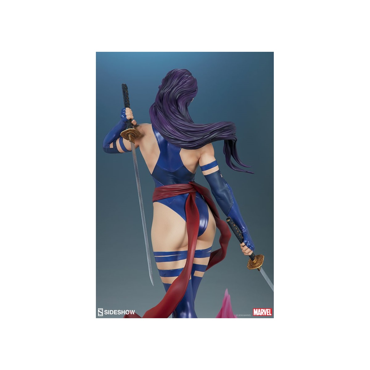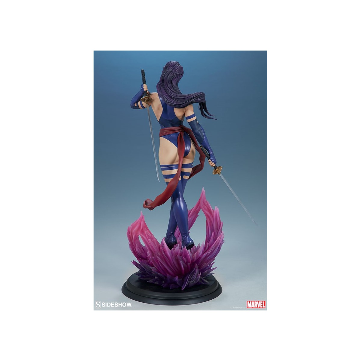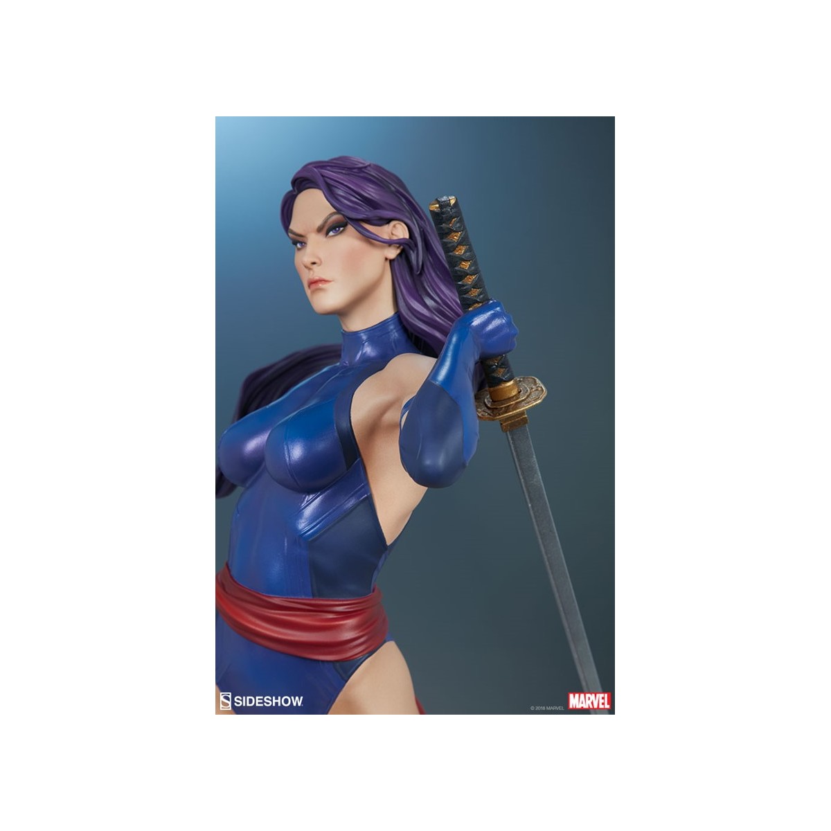 The polyresin Psylocke Premium Format™ Figure features an all-sculpt costume based on her beloved 90’s look with a blue bodysuit, arm guards, and boots. Her suit also includes a red sculpted sash, fluttering with dynamic motion as she holds her dual katanas at the ready. Psylocke’s beautifully sculpted portrait is detailed flowing purple hair and piercing purple eyes, capturing all the focus of her physical and psychic abilities.