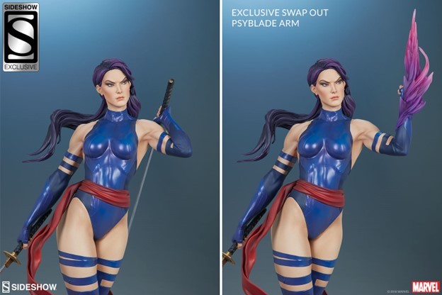 The Exclusive Edition of the Psylocke Premium Format Figure includes a swap-out left arm wielding a psyblade weapon. Manifested by her mind, this energized psychic construct makes an exciting additional display option for your Marvel statue.