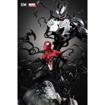 Spider-Man is seen half bonded with Venom as the symbiote extends from him, breaking into a maniacal grin.