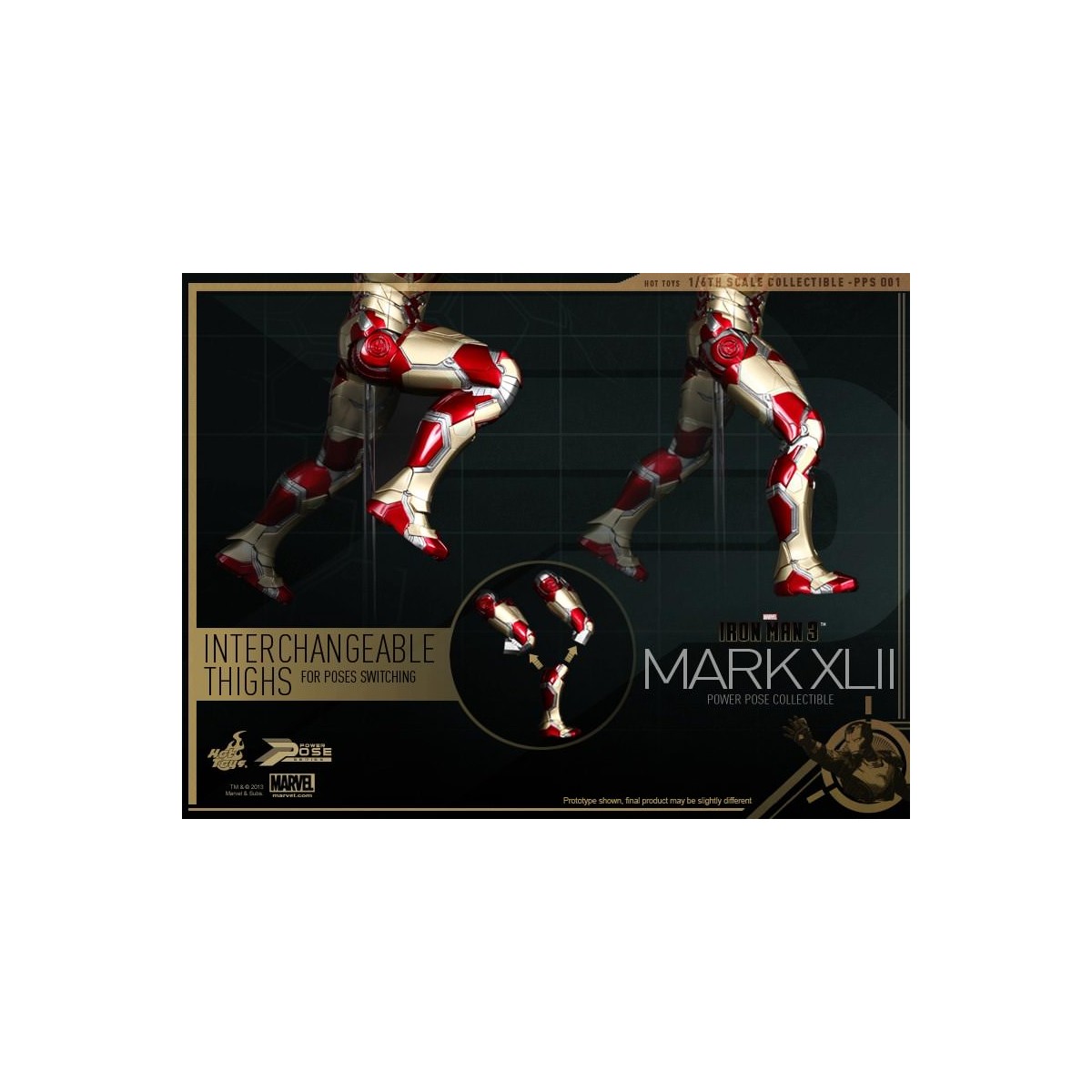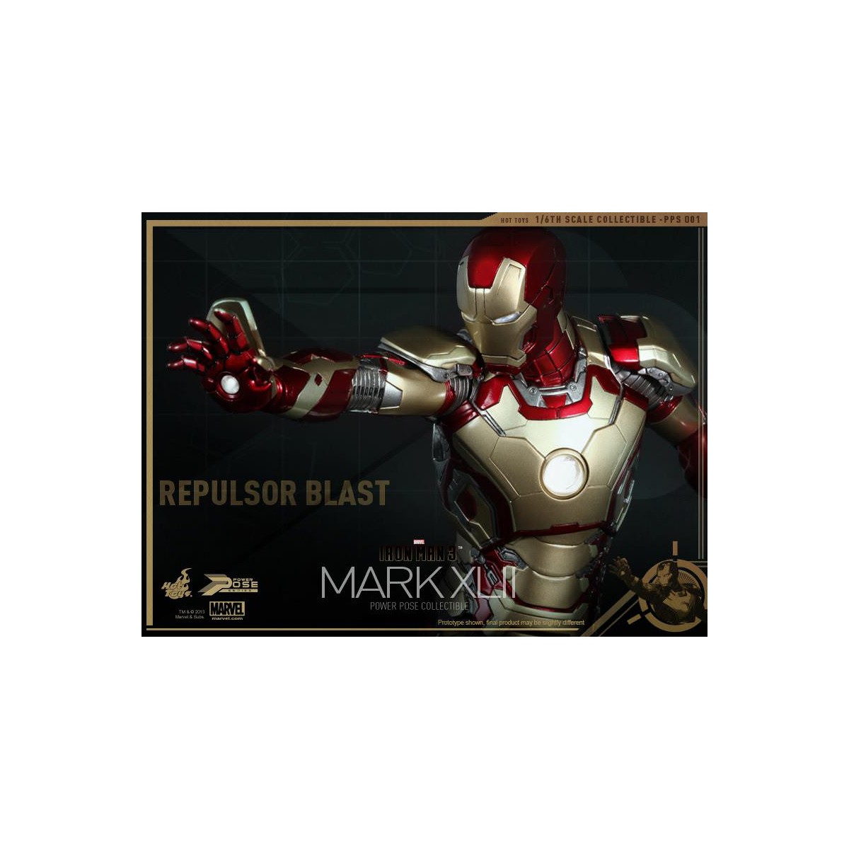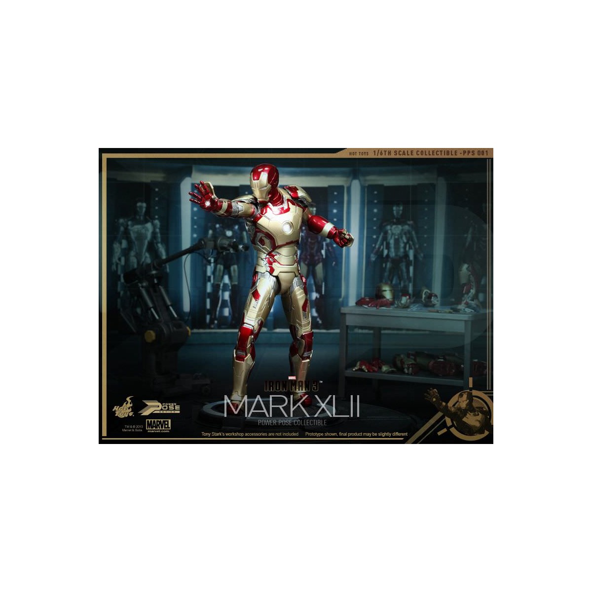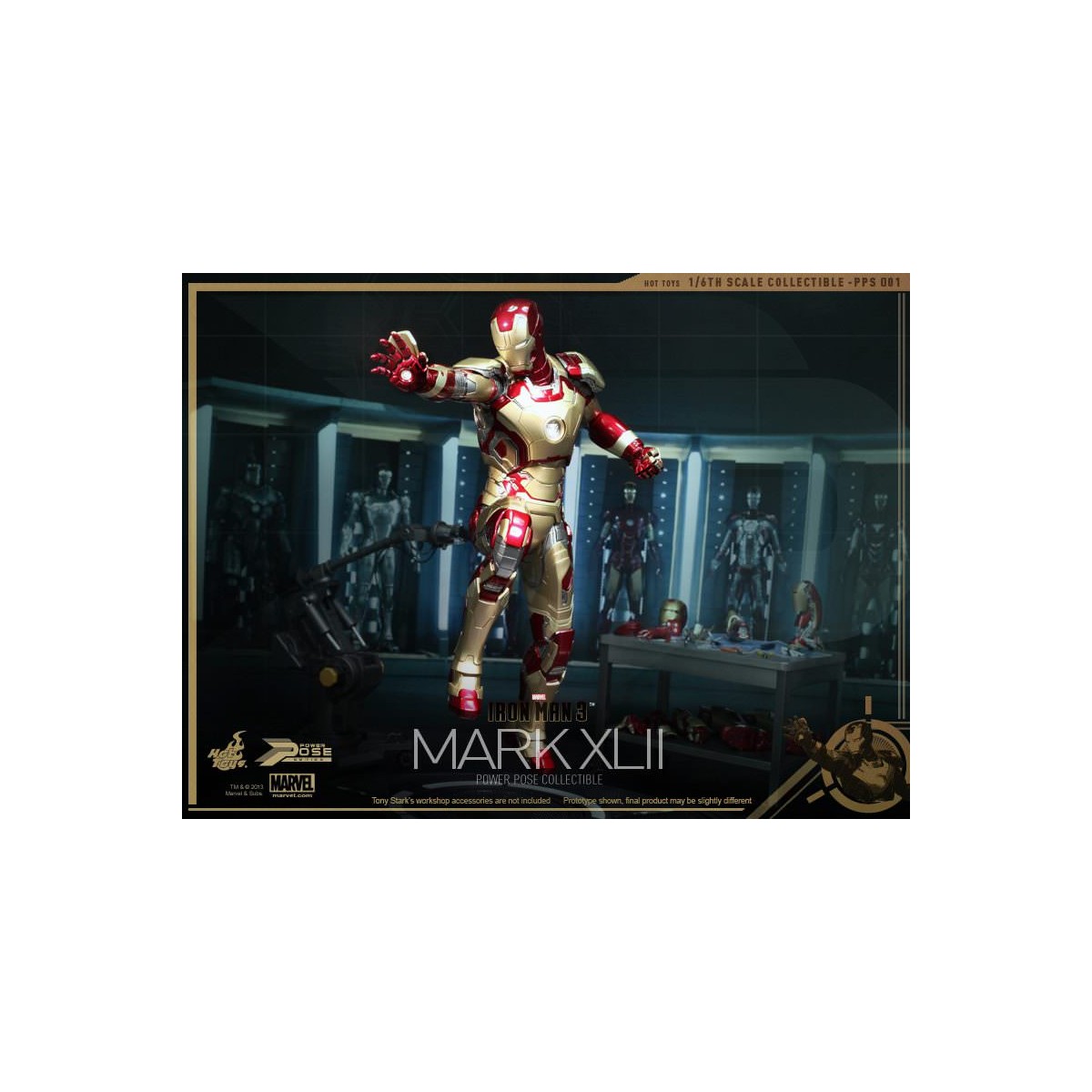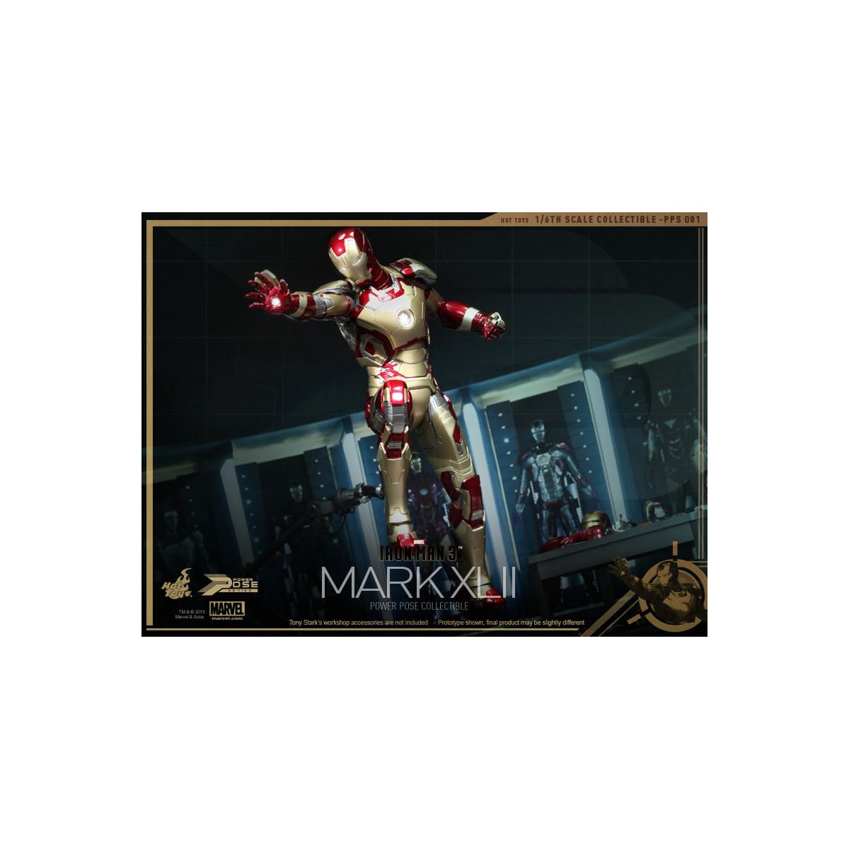 Leading the Series is the highly anticipated 1/6th scale Power Pose Mark XLII Collectible Figurine which is semi-articulated, featuring the flying and battle poses, ability to perform waist and neck twist actions closed to that in the movie, LED light-up functions and figure stand with Mark XLII and the Stark Industries nameplate.