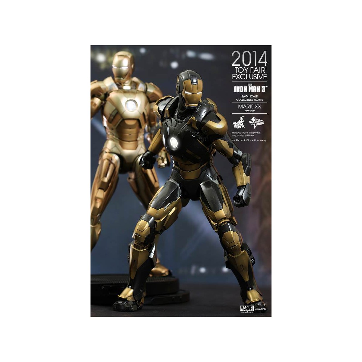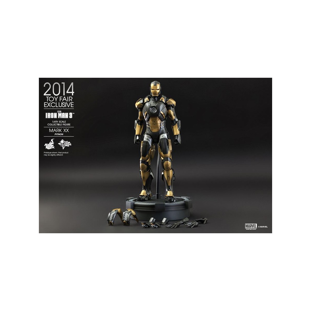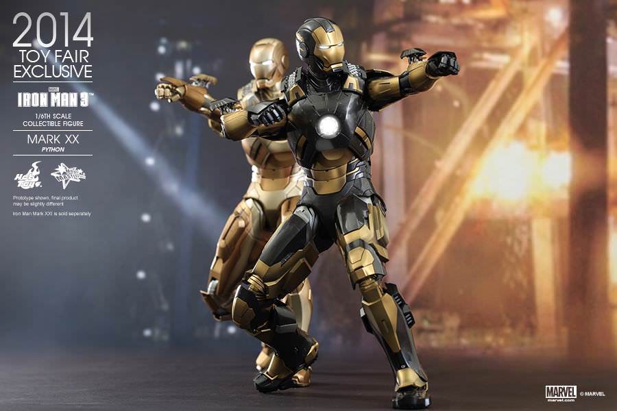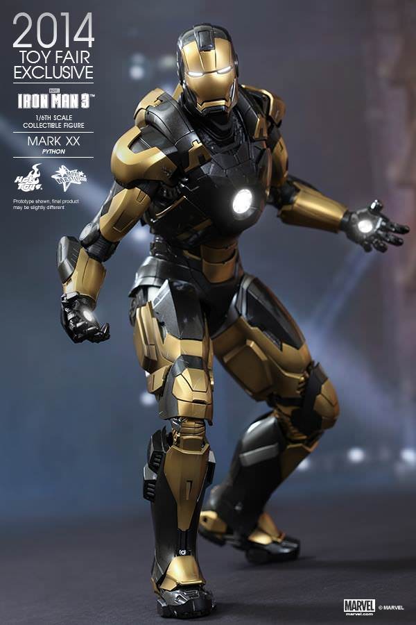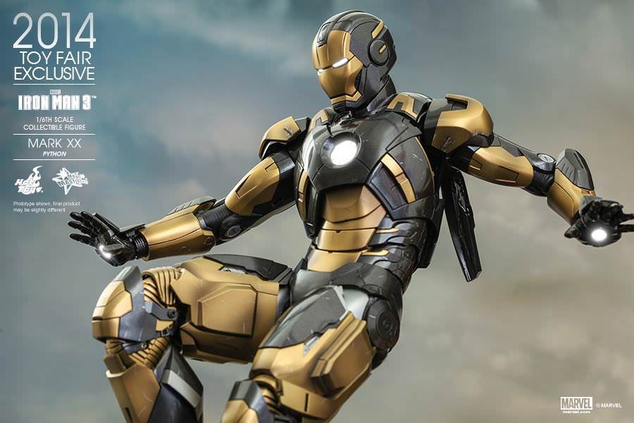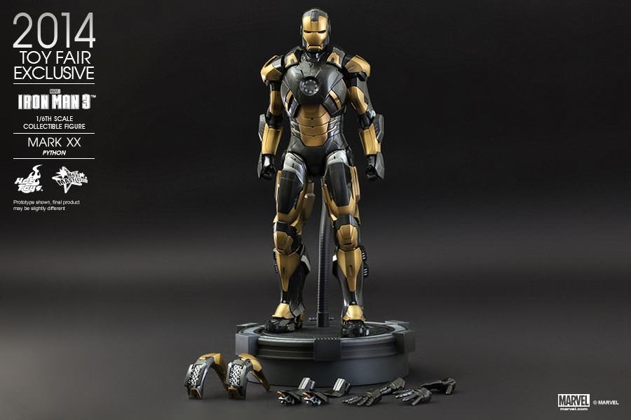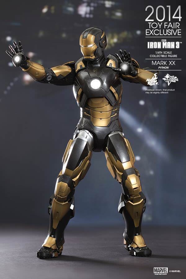 Hot Toys is happy to present the 1/6th scale Python (Mark XX) Collectible Figure, the Long Distance suit from the Iron Legion, as one of the 2014 Toy Fair Exclusive items. It features specially painted black and gold colored armor, LED light-up functions, interchangeable parts, and figure stand with flexible pillar for dynamic posing.
