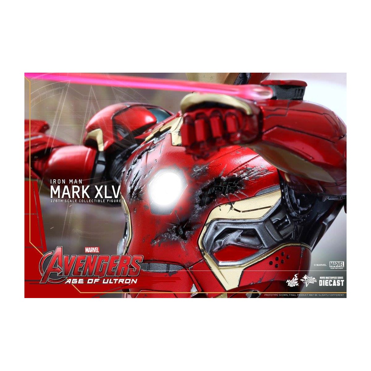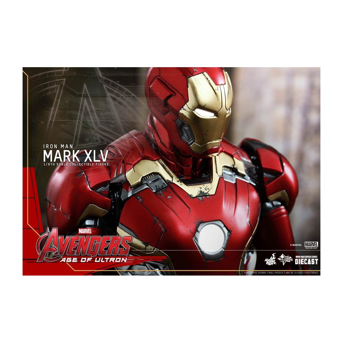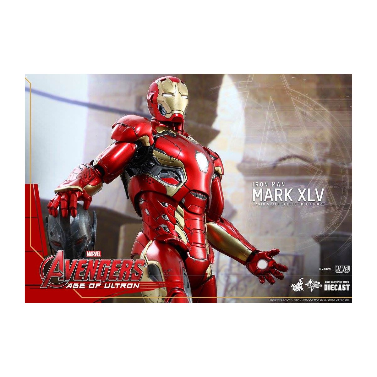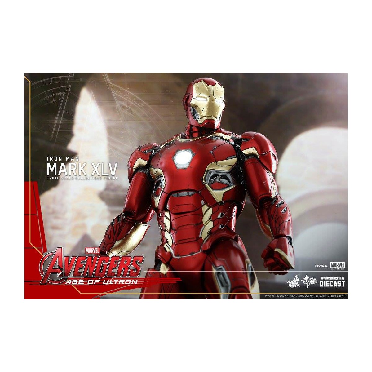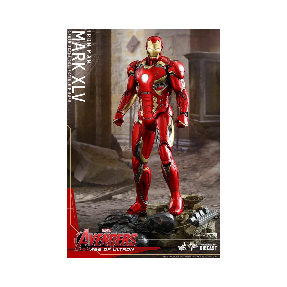 The movie-accurate Mark XLV Collectible Figure is highly detailed and sophisticatedly crafted based on the image of the armor in the film featuring a meticulously sculpted armored body, specially applied metallic red, gold and silver colored paint with weathered effects, LED light-up Arc Reactor with hexagonal-shaped indent on chest, and a specially designed diorama base with a detachable damaged Ultron Sentry (Prime)!