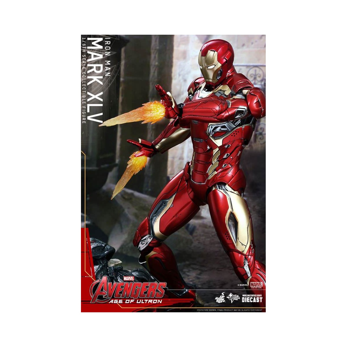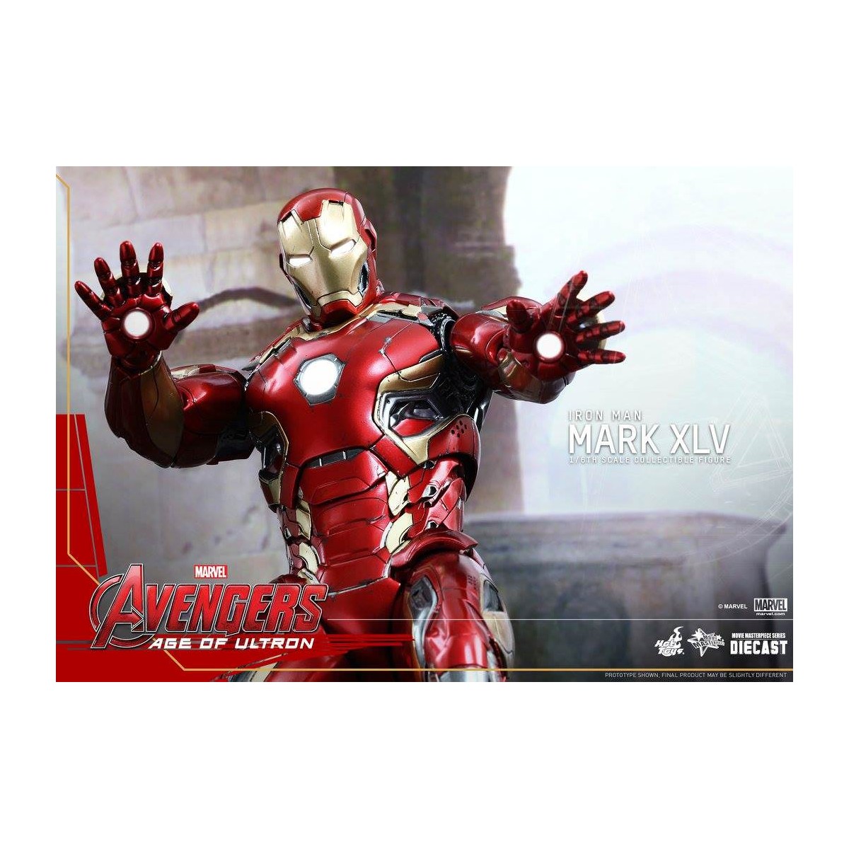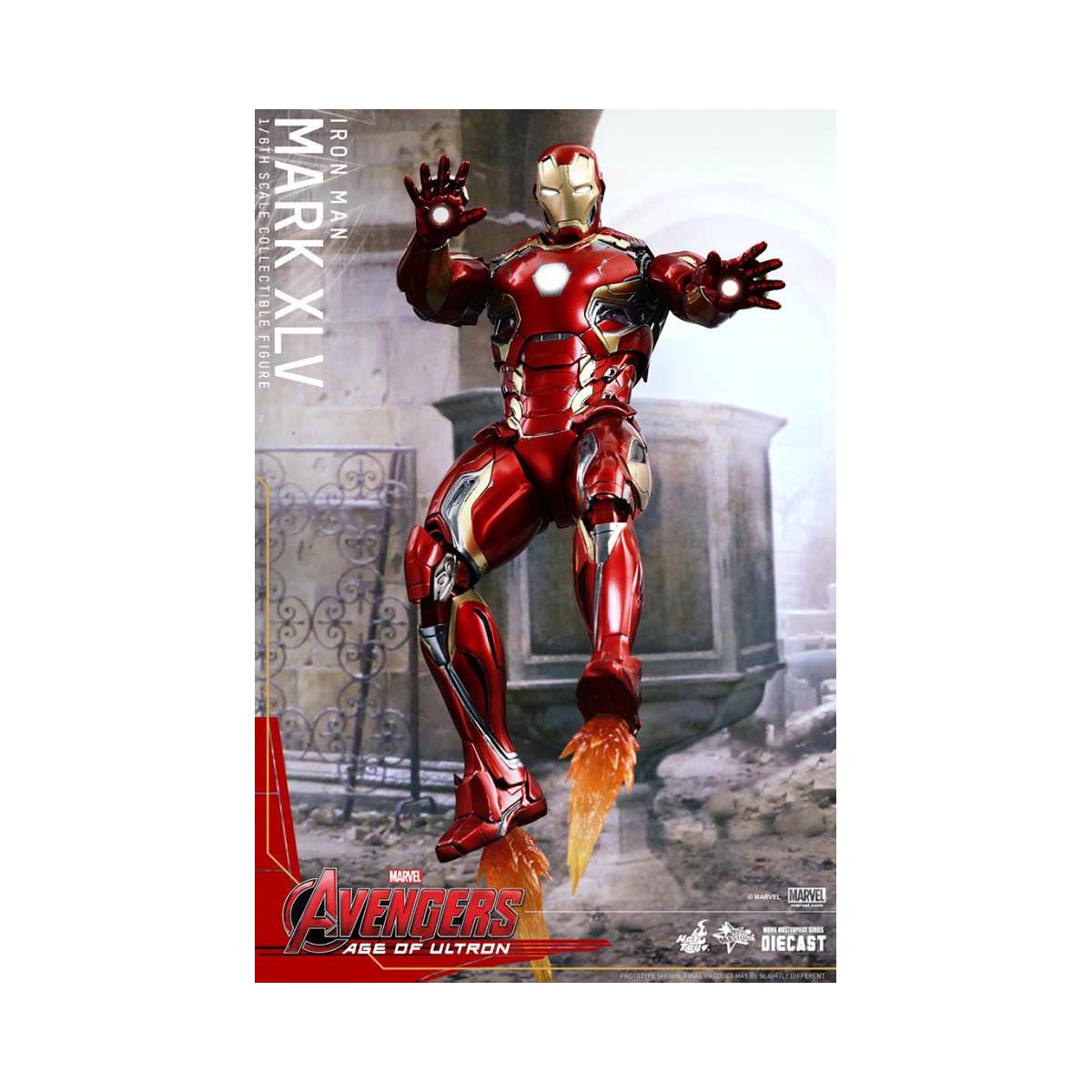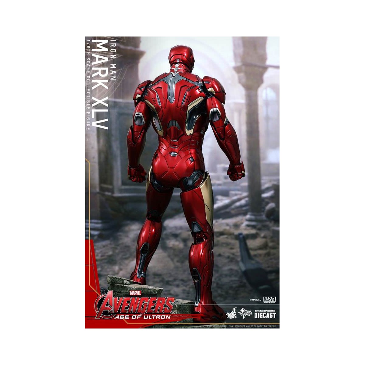 The movie-accurate Mark XLV Collectible Figure is highly detailed and sophisticatedly crafted based on the image of the armor in the film featuring a meticulously sculpted armored body, specially applied metallic red, gold and silver colored paint with weathered effects, LED light-up Arc Reactor with hexagonal-shaped indent on chest, and a specially designed diorama base with a detachable damaged Ultron Sentry (Prime)!