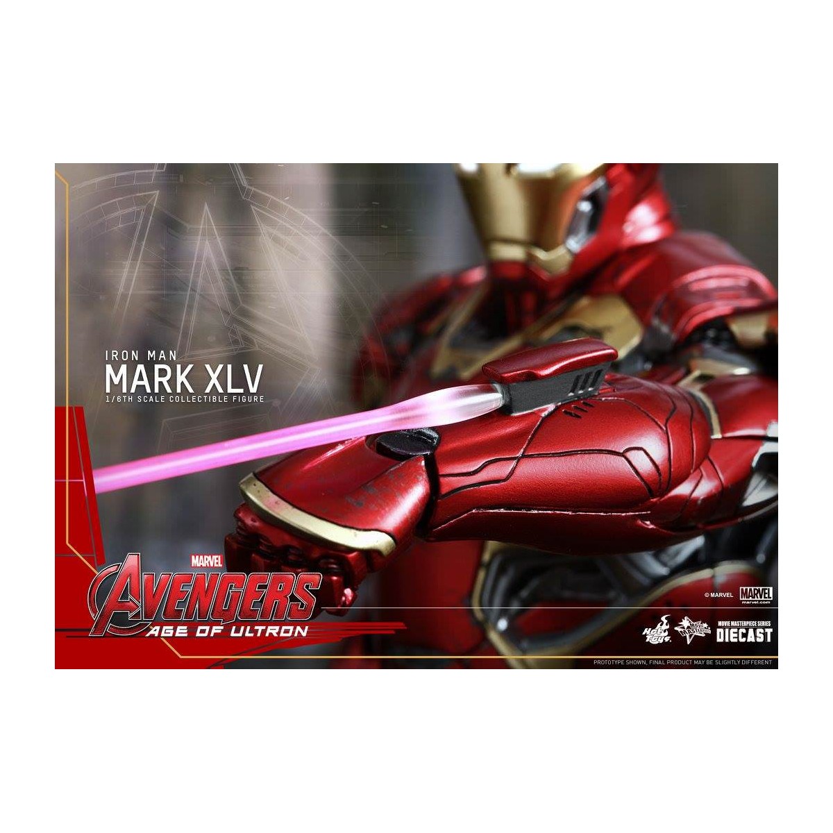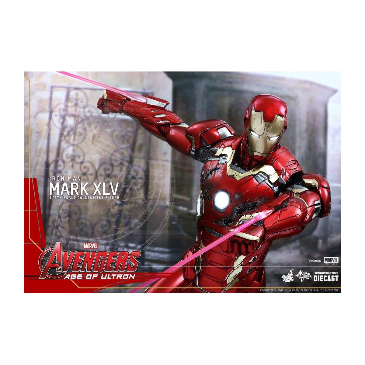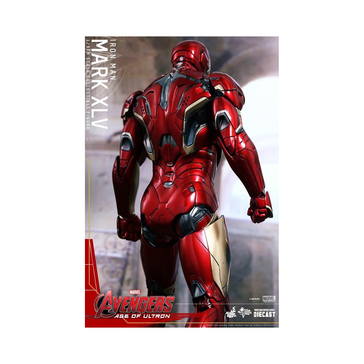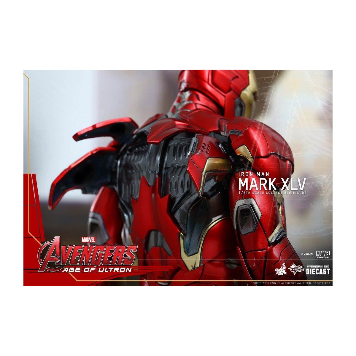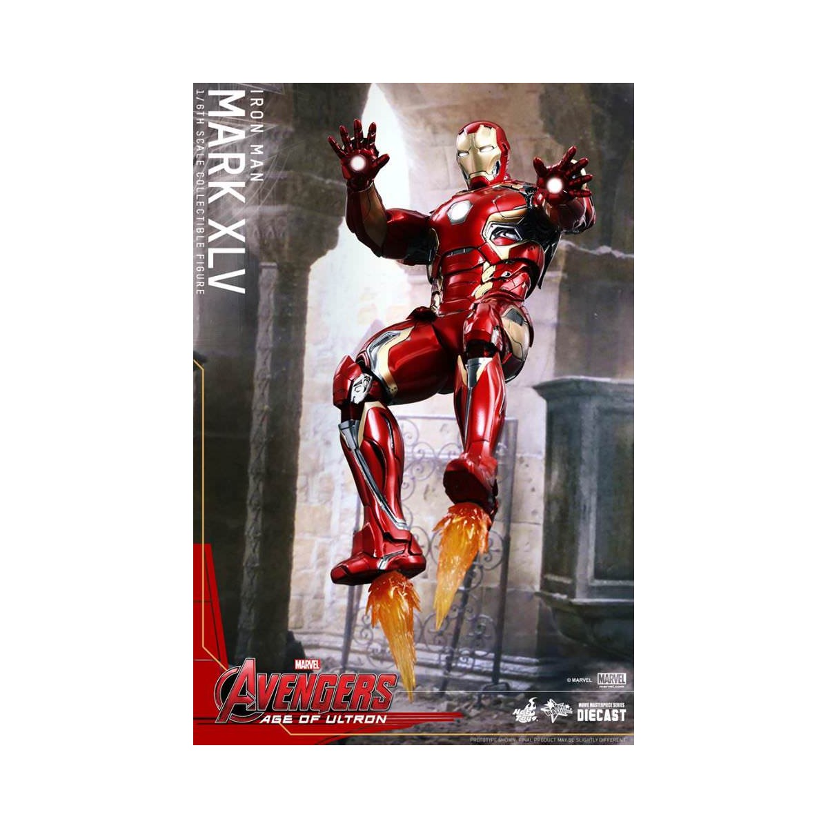 The movie-accurate Mark XLV Collectible Figure is highly detailed and sophisticatedly crafted based on the image of the armor in the film featuring a meticulously sculpted armored body, specially applied metallic red, gold and silver colored paint with weathered effects, LED light-up Arc Reactor with hexagonal-shaped indent on chest, and a specially designed diorama base with a detachable damaged Ultron Sentry (Prime)!