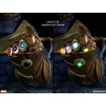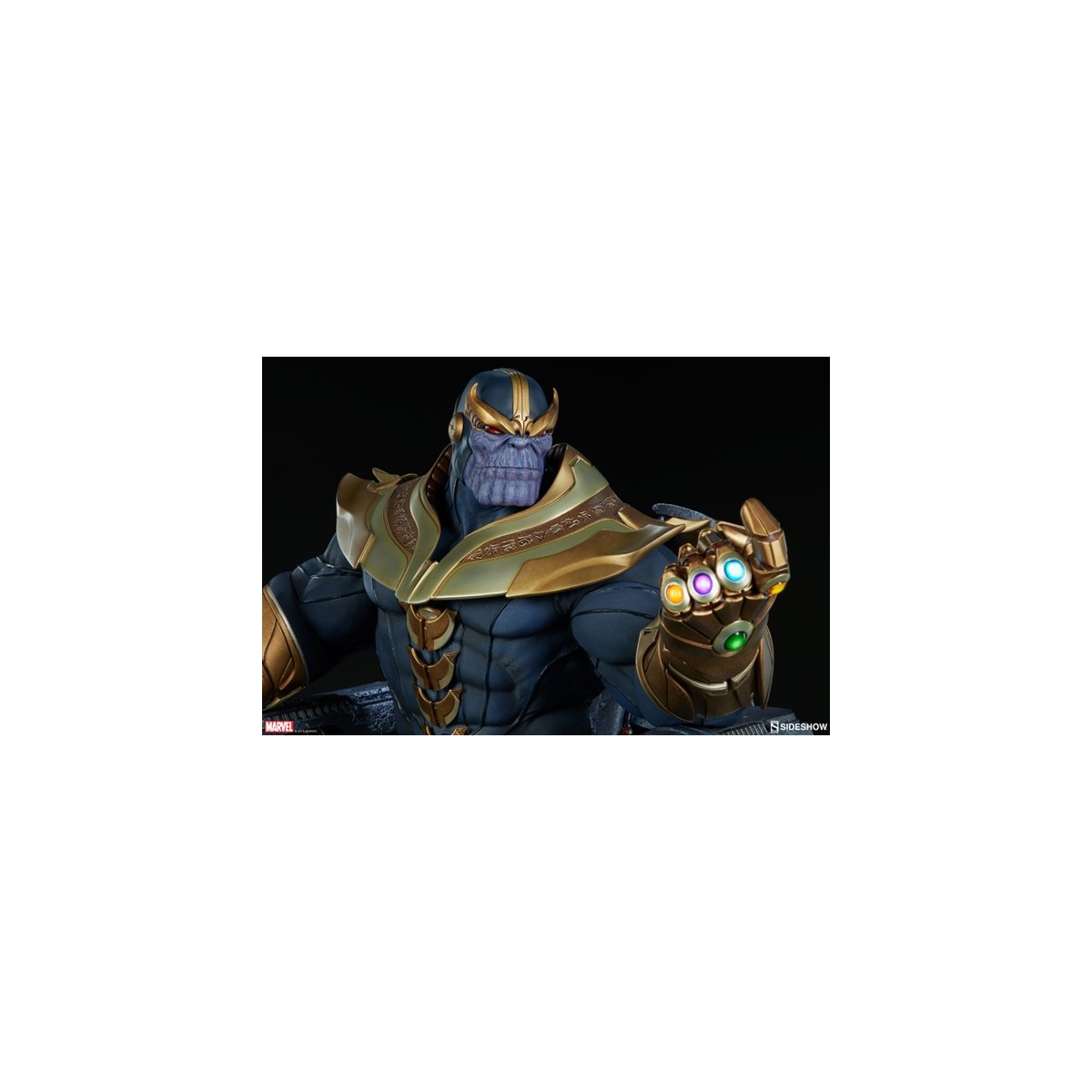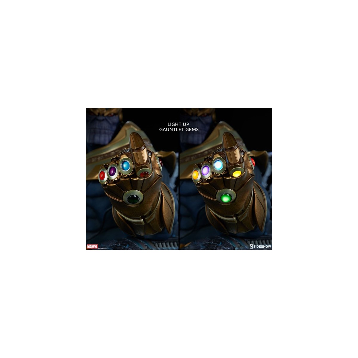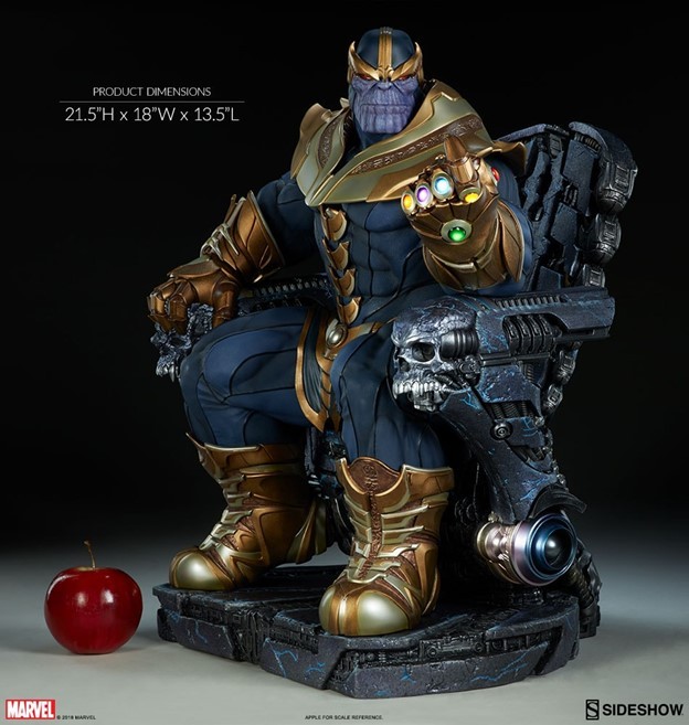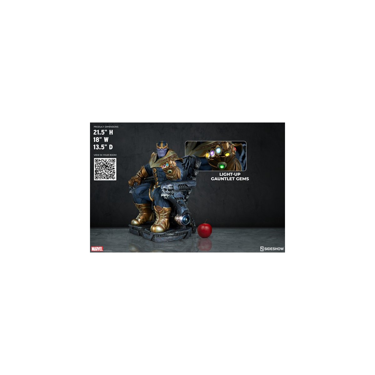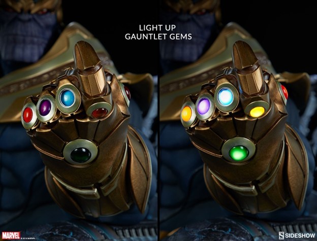 The Thanos on Throne Maquette stands over 20” high, the Mad Titan's grim visage lit by the brightly lit gems of his Infinity Gauntlet.