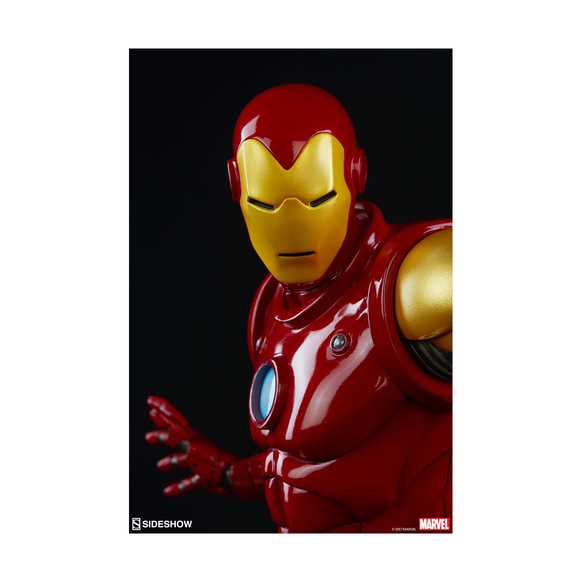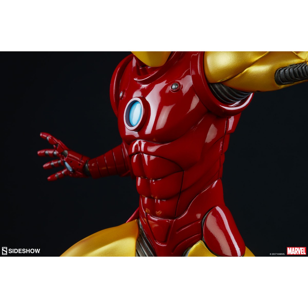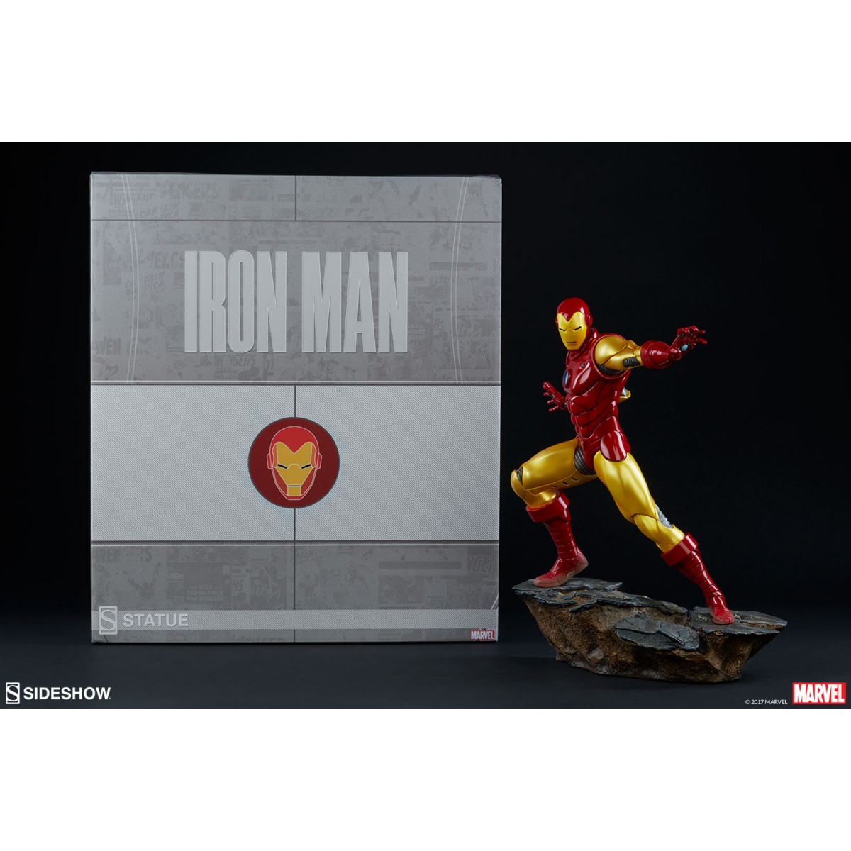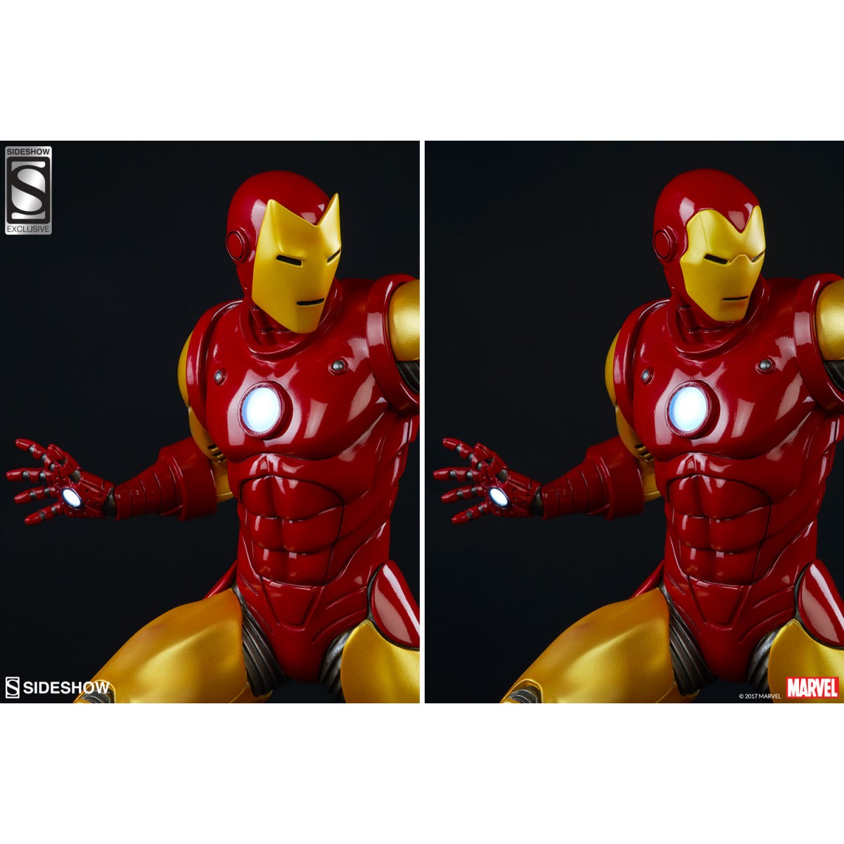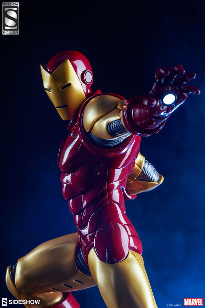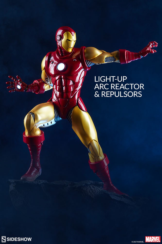 Depicting the now instantly recognizable armor and standing at 15.75” tall, this 1:5 scale statue features light up hands and chest and is crafted out of resin. The Sideshow Exclusive variation includes the classic Iron Man portrait as a swap-out option.