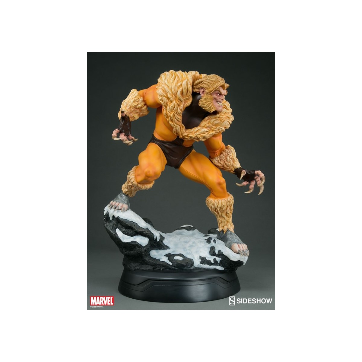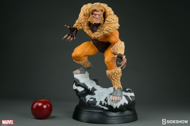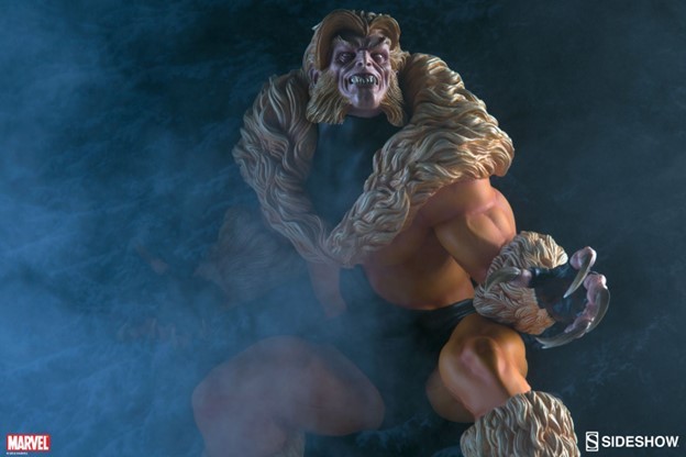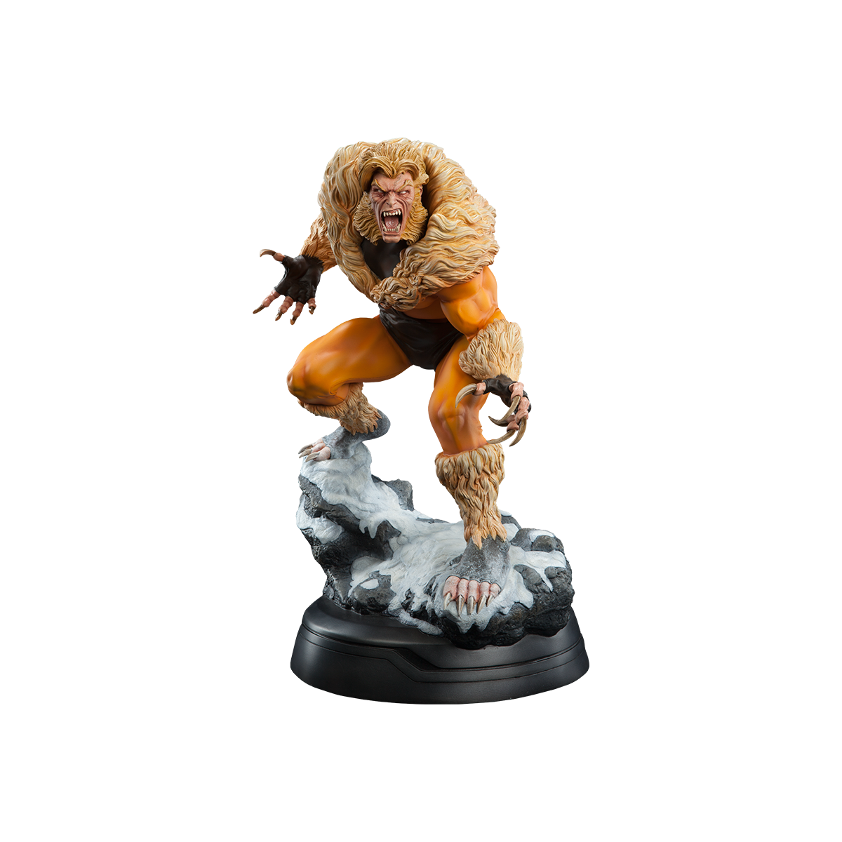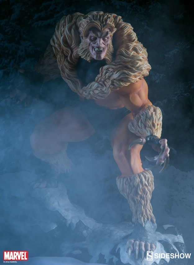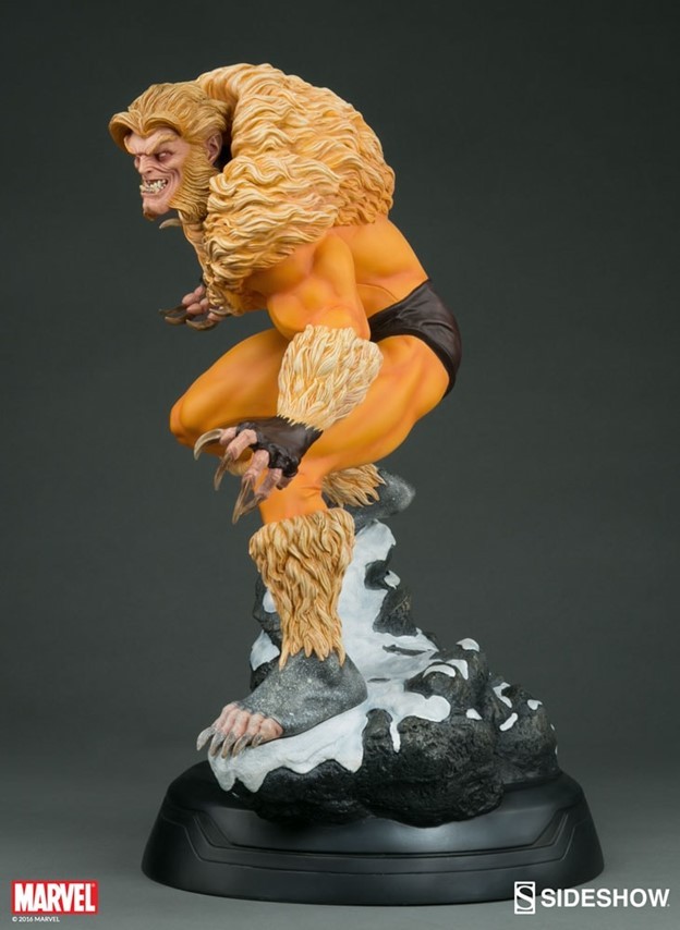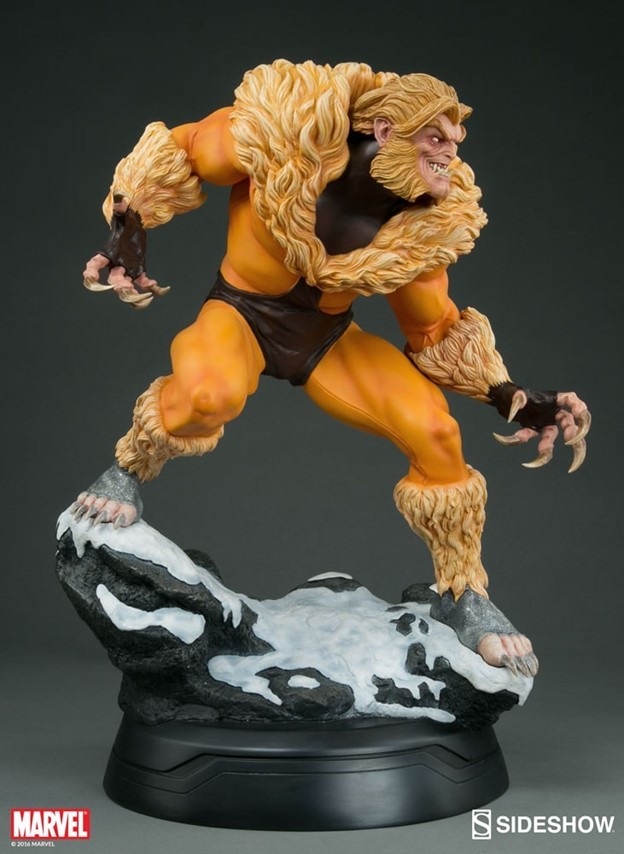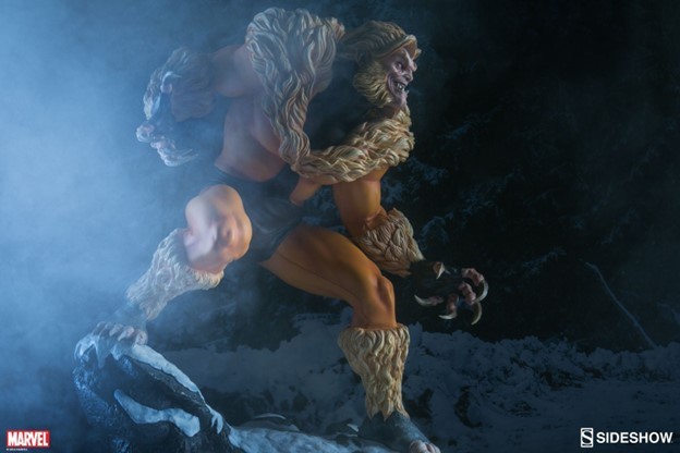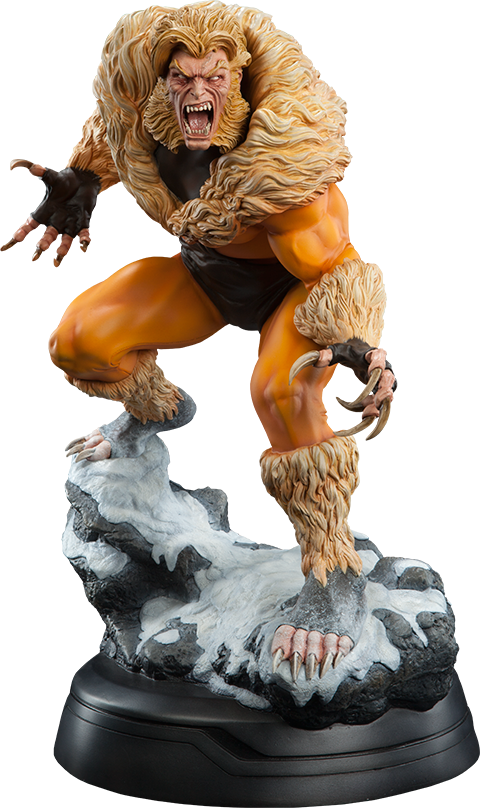 A former subject of the notorious ‘Weapon X’ project, Victor Creed embraced his primal instincts when he became the feral mutant, Sabretooth. Crouched over a snow-covered slab of arctic terrain, the ruthless predator bristles in anticipation of his next clash with longtime rival, Wolverine. Fangs bared in a vicious sneer, and muscles rippling under his classic fur-trimmed brown and gold costume, Creed relishes the moment before they cross paths, just itching to tear into the flesh of his greatest foe.