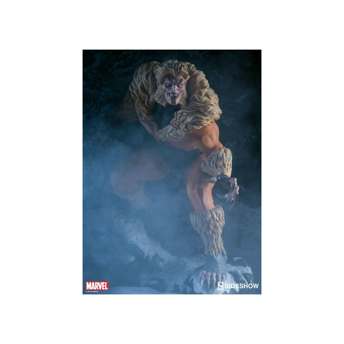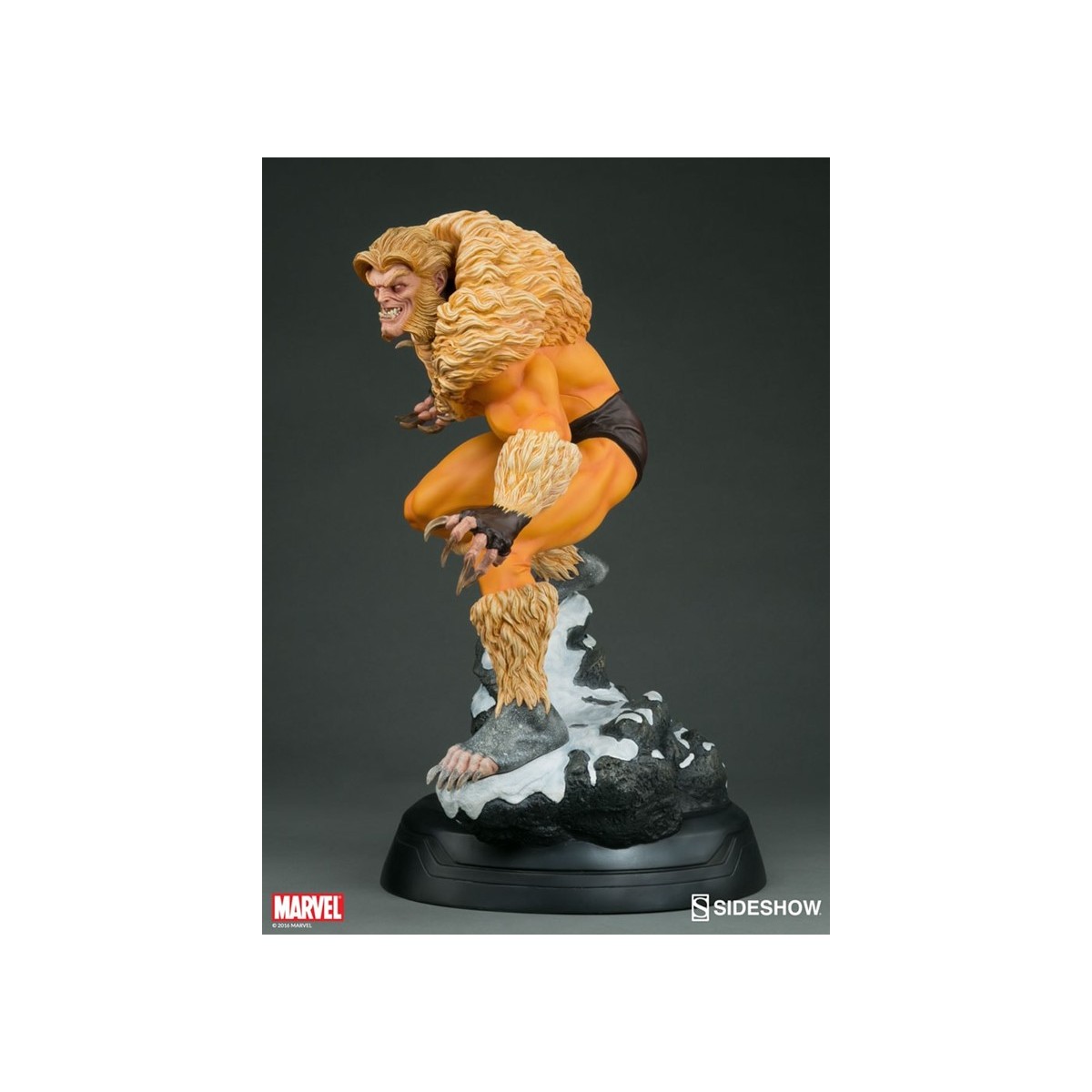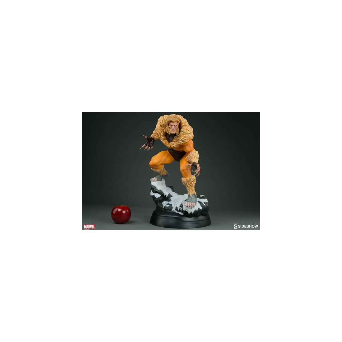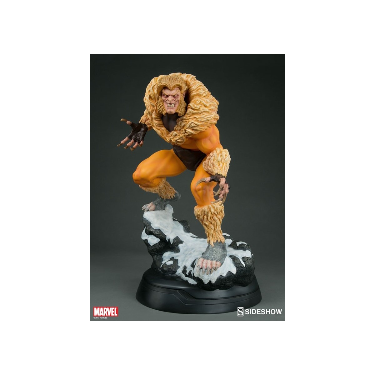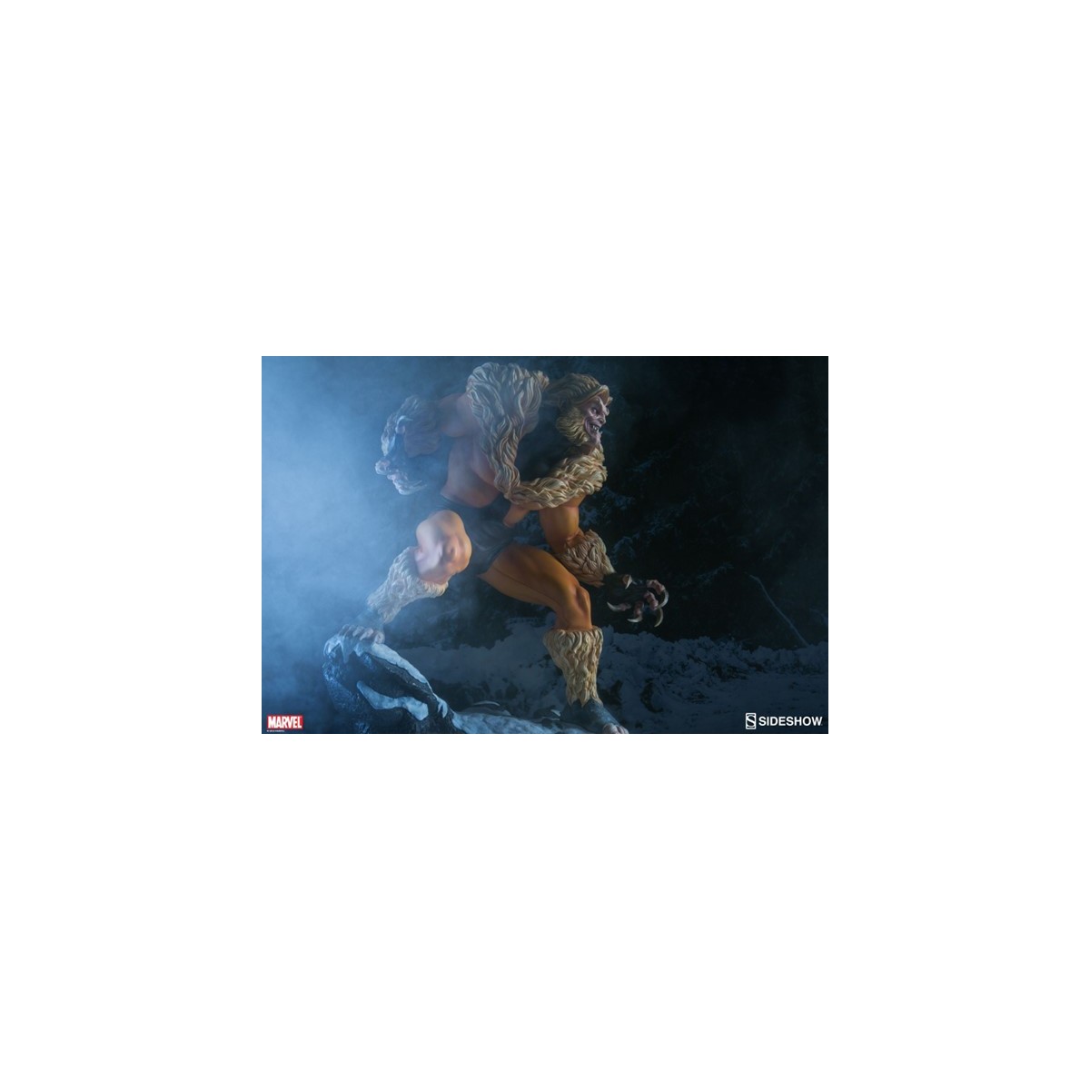 A former subject of the notorious ‘Weapon X’ project, Victor Creed embraced his primal instincts when he became the feral mutant, Sabretooth. Crouched over a snow-covered slab of arctic terrain, the ruthless predator bristles in anticipation of his next clash with longtime rival, Wolverine. Fangs bared in a vicious sneer, and muscles rippling under his classic fur-trimmed brown and gold costume, Creed relishes the moment before they cross paths, just itching to tear into the flesh of his greatest foe.