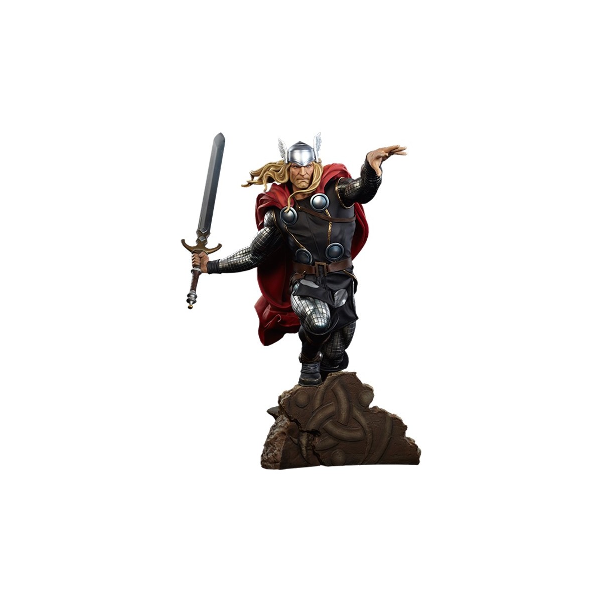A champion among gods and men, and one of Earths Mightiest Heroes, the Asgardian Avenger is renowned across the Nine Worlds for his bravery, strength and fury. Inspired by costume designs defined by Marvel artist Olivier Coipel, the warrior god launches onto the battlefield in a dynamic composition wearing his winged helmet, intricately sculpted metallic mail, a hand-tailored fabric tunic with gold piping and armor disc plates. With his dramatic sculpted red cape billowing out behind him, collectors can display Thor delivering a mighty blow from the divine hammer Mjolnir, or the all-powerful Odinsword, Ragnarok. Fierce determination etched on his face, it is plain to see that Thor will stop at nothing to defend those who cannot defend themselves.