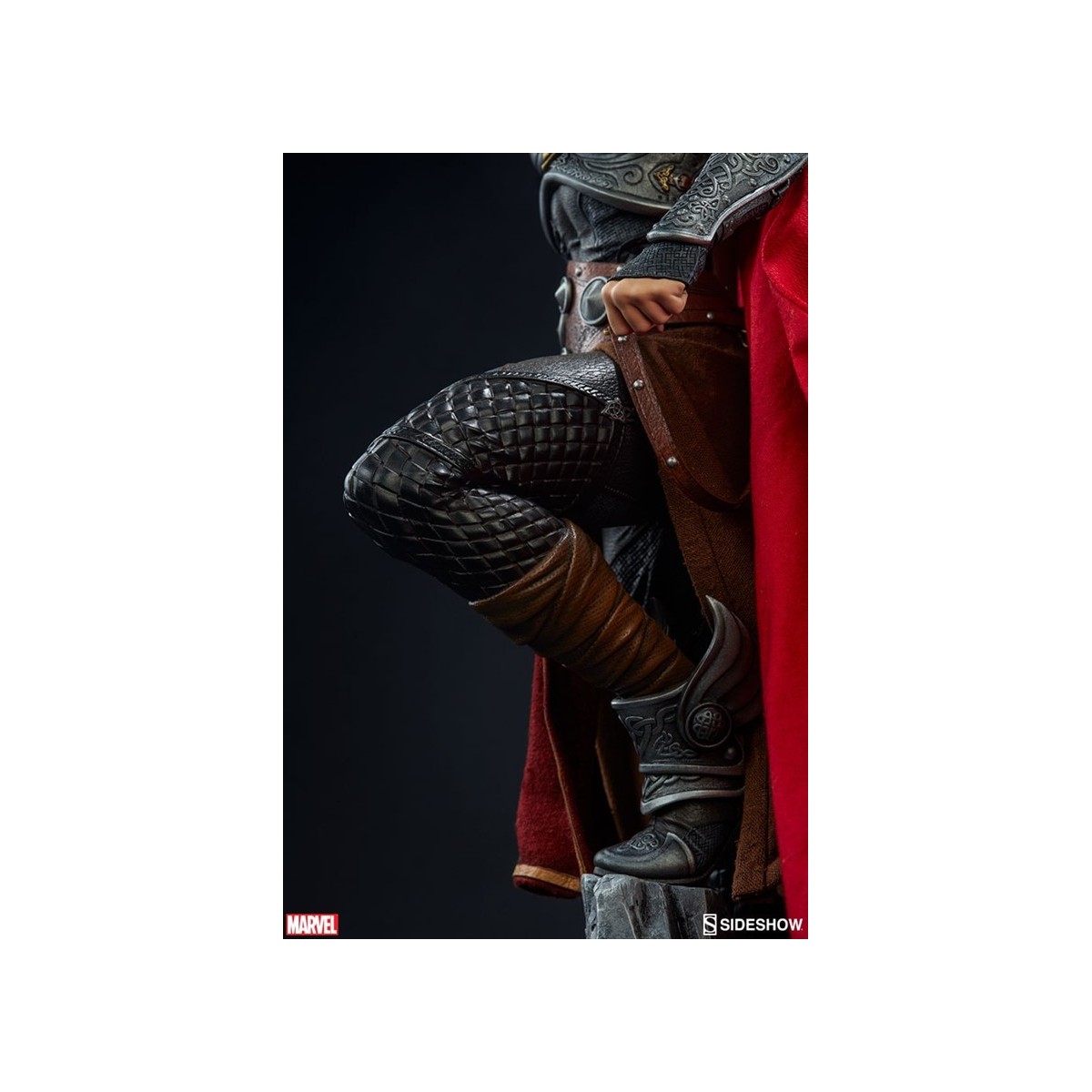 Standing over 20” high, the Goddess of Thunder stands on a mountaintop, resplendent in a winged helm, highly detailed and layered mail armor and lustrous red cape.
